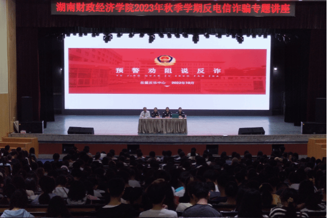 (本网讯)10月25日,学校在主校区大礼堂举办反电信诈骗知识专题讲座,邀请岳麓区公安分局刑侦大队副大队长、反诈中心主任唐贝,湘江新区协调办岳麓反诈中心宣讲员王紫威为学生传授反诈知识。讲座由保卫部部长郭志伟主持。