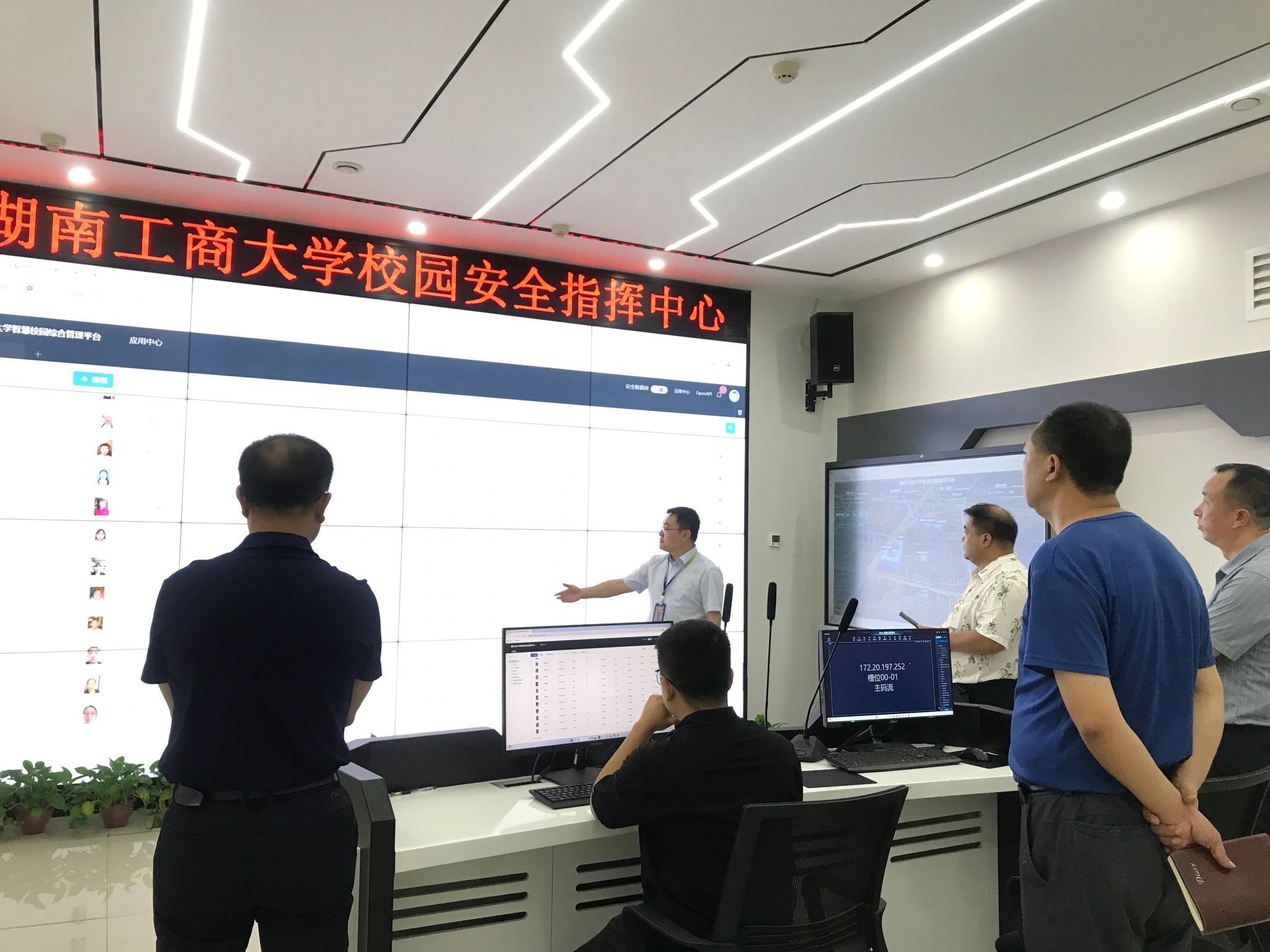 湖南工商大学保卫部部长任治介绍了学校在机构设置、人员配备、物防、技防等方面的情况,双方认真探讨了学校多校区安全管理模式、经费保障、责任落实以及校园智慧安防建设等问题。参观了工商大学新建的校园安全指挥中心,详细了解了智慧校园安防系统在车辆动态管理、人员活动轨迹、学生宿舍管理、森林防火等方面的功能和消防实时监控运行情况。