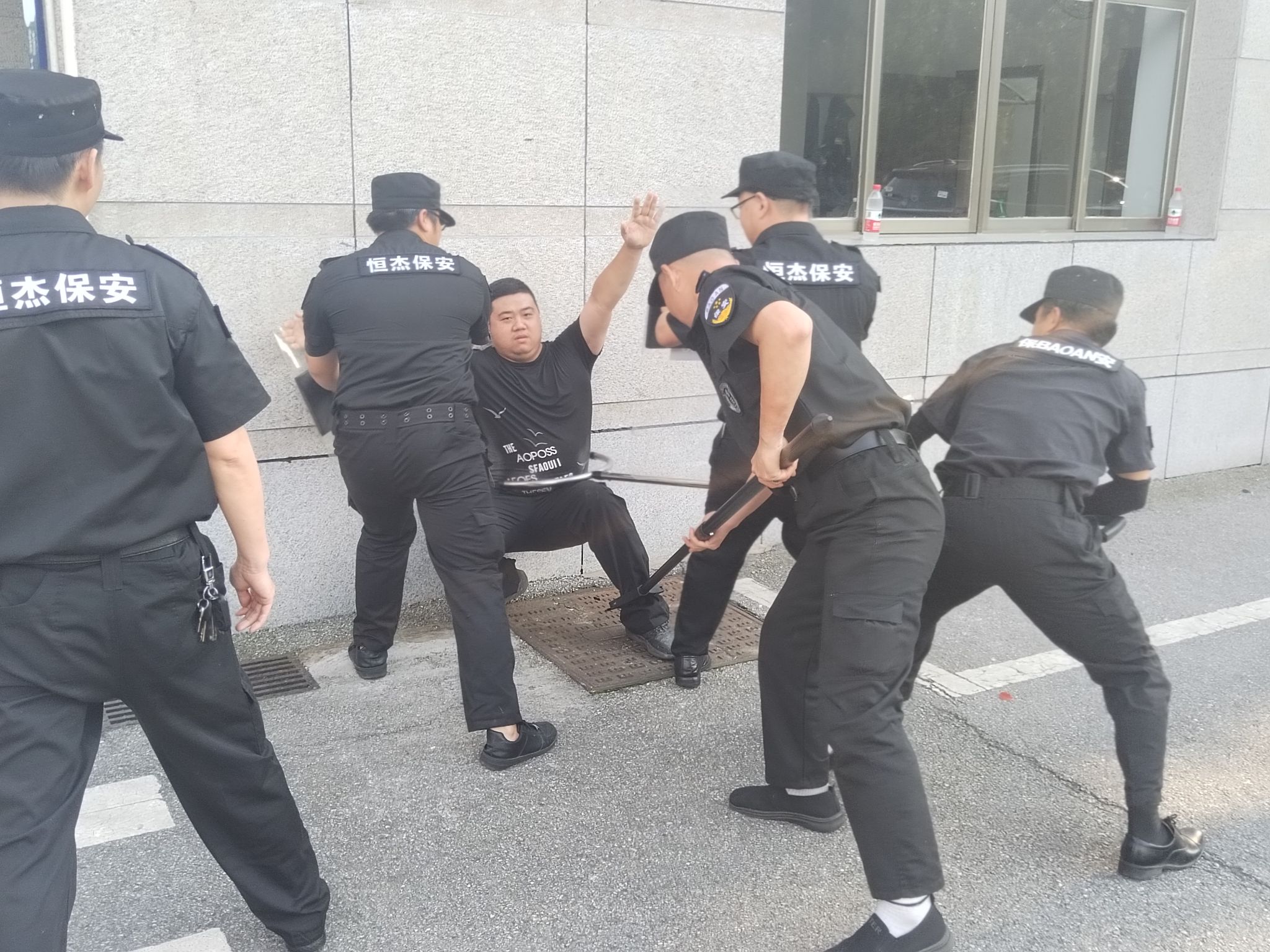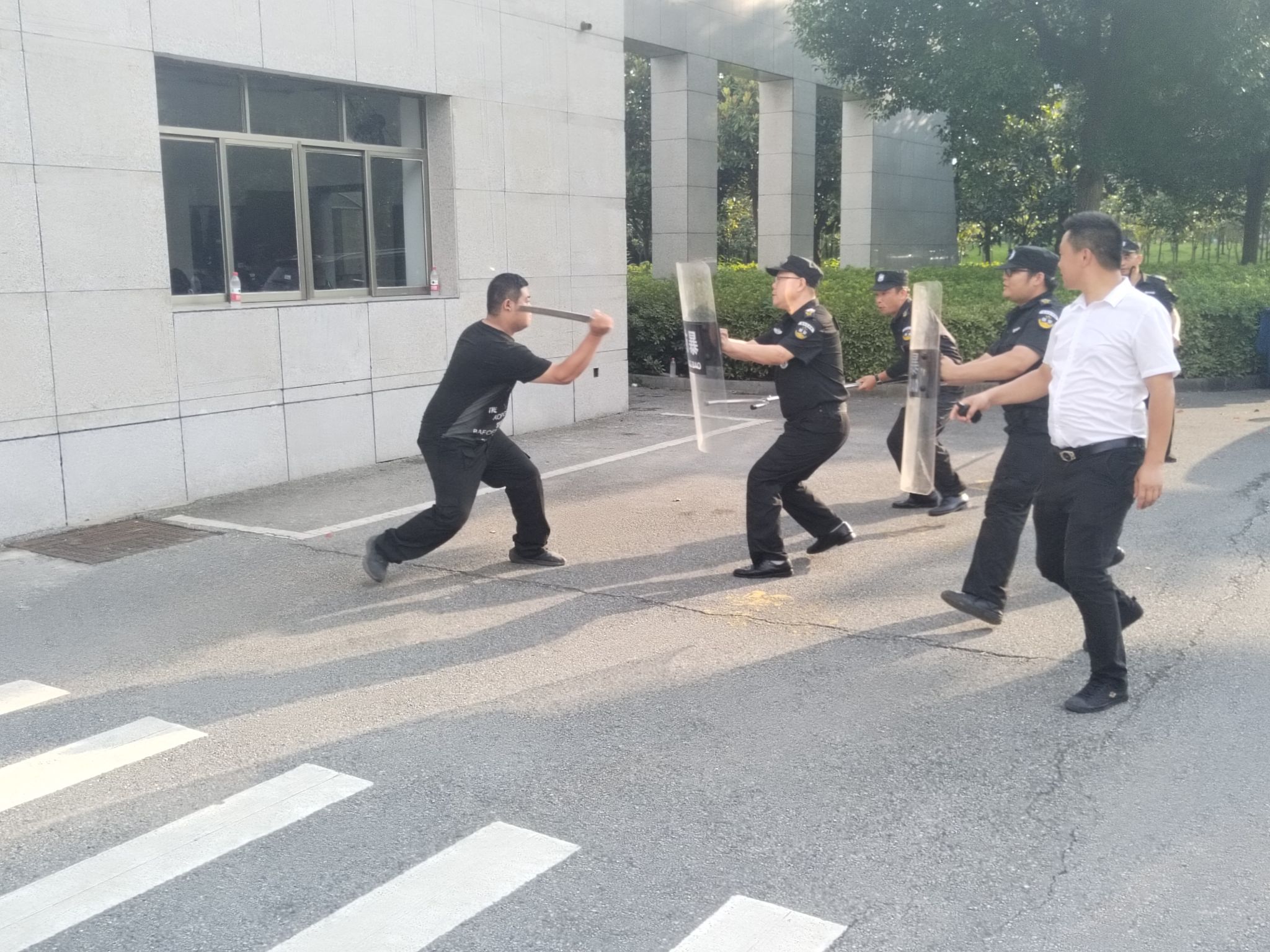 在接下来的反恐演练场景中,一“暴恐分子”在南门入口闸道处,不肯登记个人信息、不听门卫劝阻,突然越过闸门、手持砍刀向门岗值勤人员砍去。值勤人员果断撤退,并火速呼叫支援。手持防爆盾、腰叉、脚叉等防爆器材的备勤人员迅速赶到现场,利用防暴器材将“暴恐分子”就地制服。