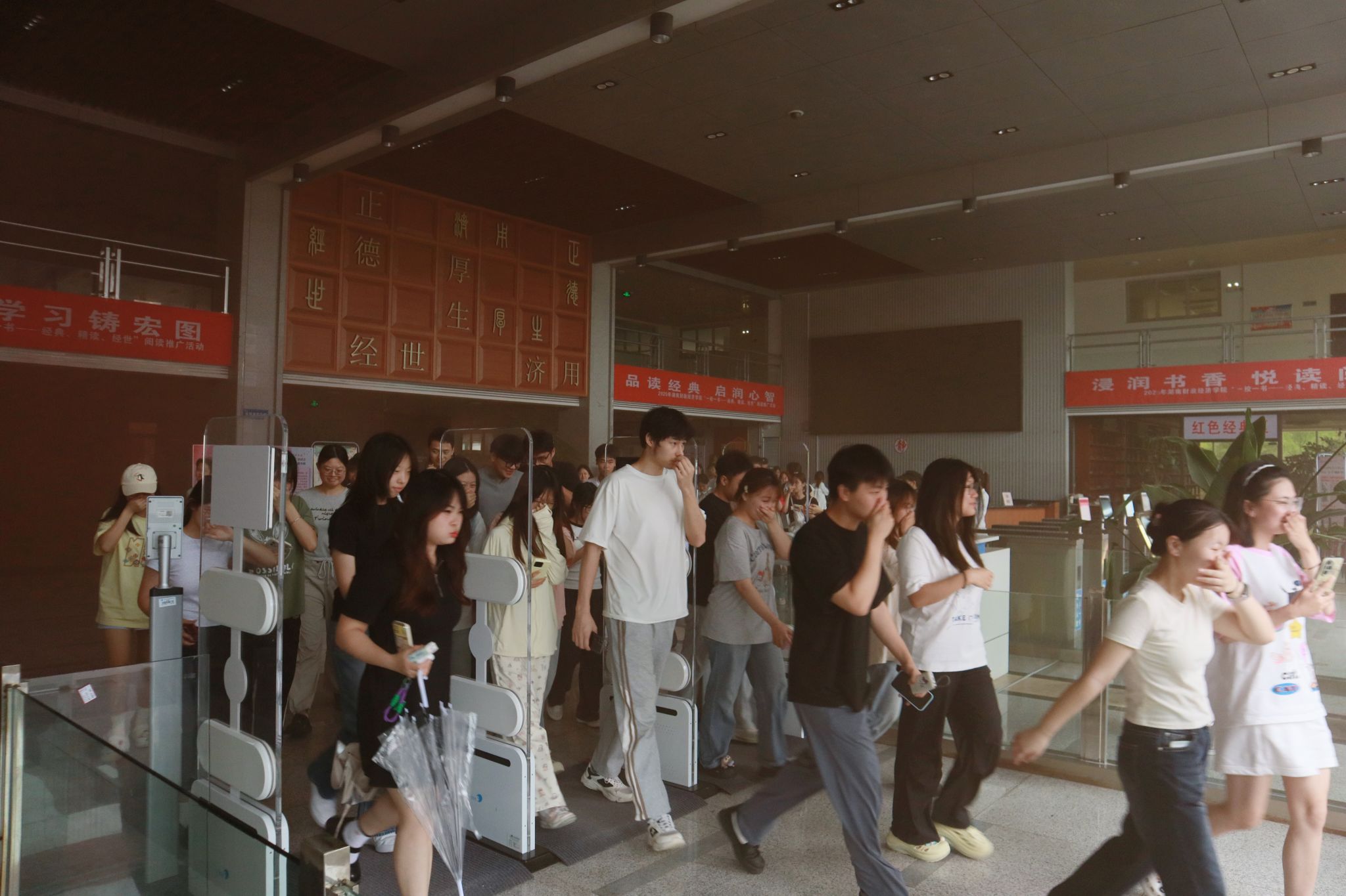 启动仪式后,刘钟理宣布演练开始。图书馆二楼中庭、五楼阅览室等模拟火灾区域迅速释放烟雾弹,馆内电梯自动关闭、电源切断,消防报警系统自动启动。在声光警报与疏散广播引导下,图书馆工作人员立即组织各楼层学生撤离,学校微型消防站值守人员同步赶赴“起火点”扑救初起火灾。