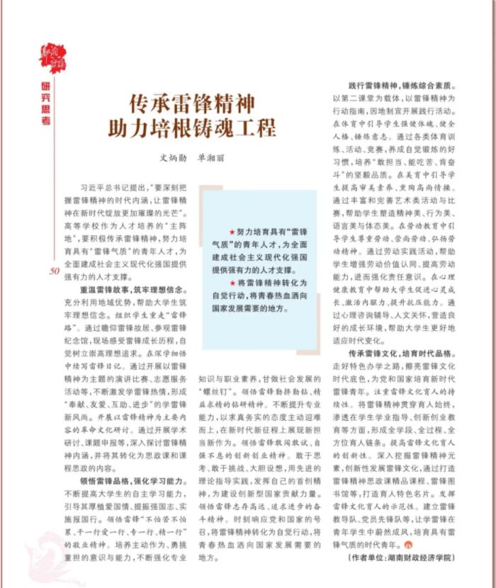 习近平总书记提出,“要深刻把握雷锋精神的时代内涵,让雷锋精神在新时代绽放更加璀璨的光芒”。高等学校作为人才培养的“主阵地”,要积极传承雷锋精神,努力培育具有“雷锋气质”的青年人才,为全面建成社会主义现代化强国提供强有力的人才支撑。