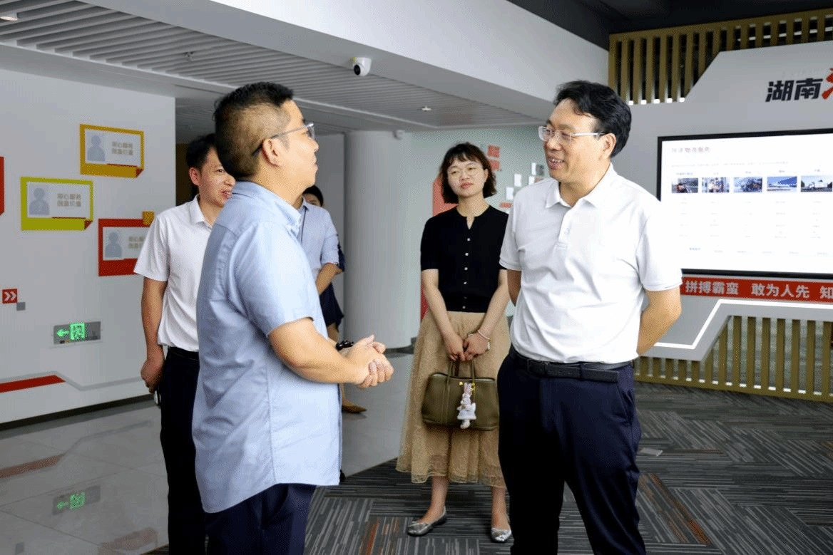 在顺丰速运集团湖南区负责人顾颐杰等人陪同下,易棉阳一行参观了企业文化长廊展厅,深入了解企业发展历程以及供应链管理、跨境电商、无人机配送等核心业务,实地感受其在自动化分拣、物联网追踪、大数据调度等数智化转型领域的创新成果。