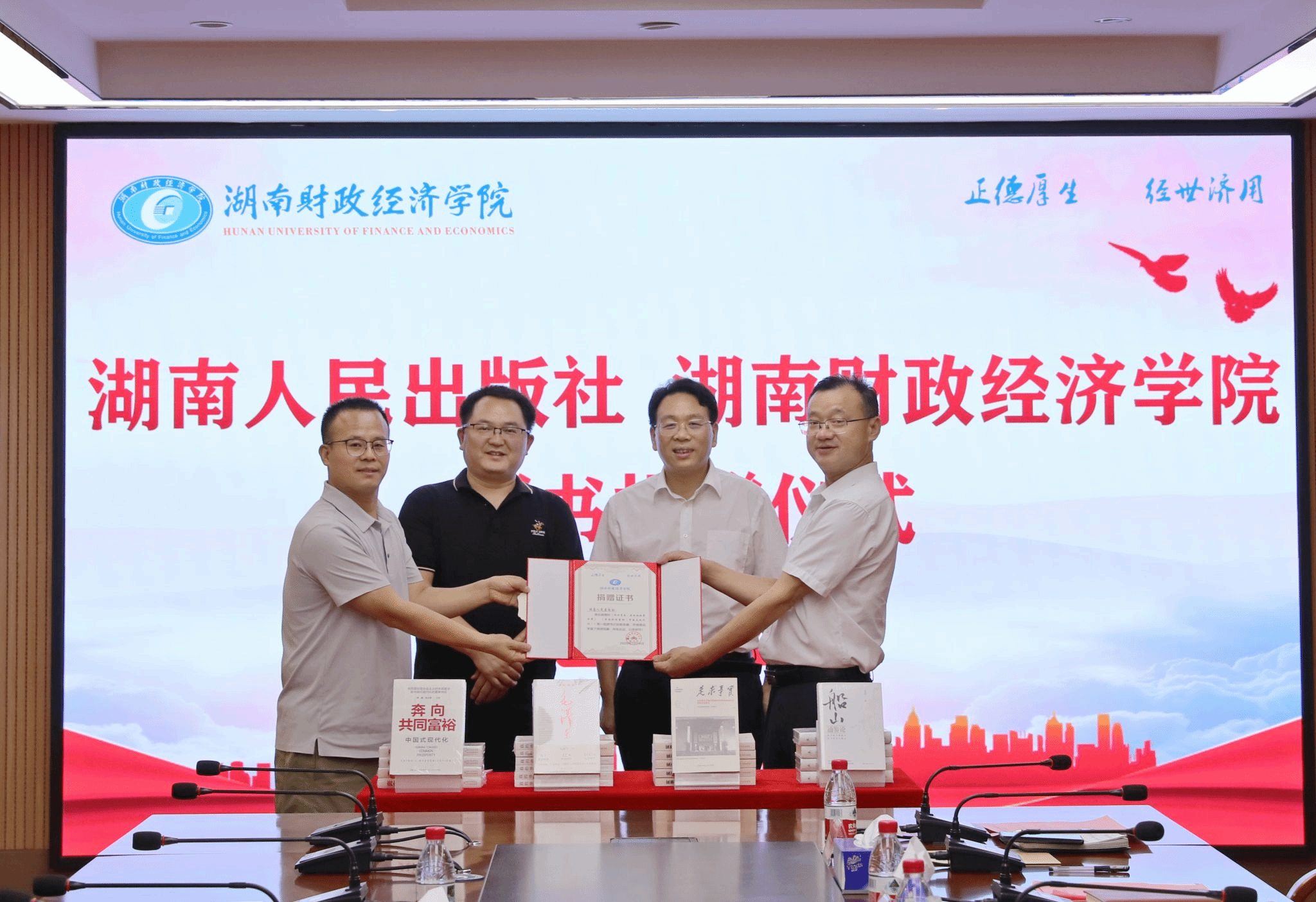(本网讯)7月14日下午,湖南人民出版社捐赠图书仪式在Beat365办公楼715会议室举行。湖南人民出版社党委书记、社长张勤繁,副社长彭翔,校党委书记易棉阳,副校长潘爱民,党委委员、宣传部、统战部部长文炳勋出席捐...