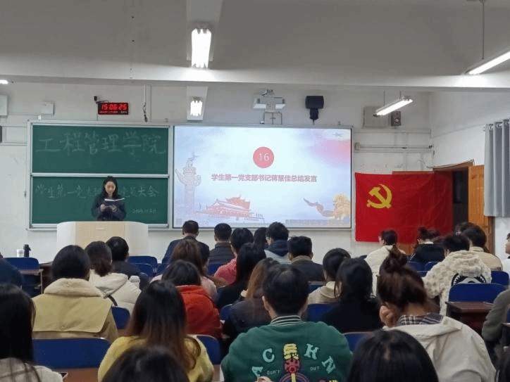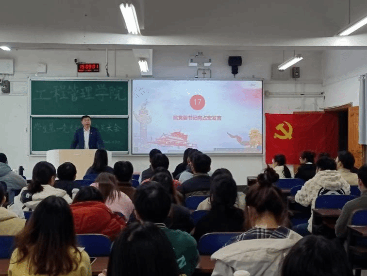 (本网讯)工程管理学院学生第一党支部于2023年11月30日下午14:00在3310教室顺利召开全体党员大会。列席本次会议的有工程管理学院党委书记向占宏、学生第一党支部书记蒋慧佳、22级辅导员陈龙雨、工程管理学院学生第一党支部全体学生党员及2023下半年发展对象。本次大会由学生第一党支部副书记徐莎莎主持。