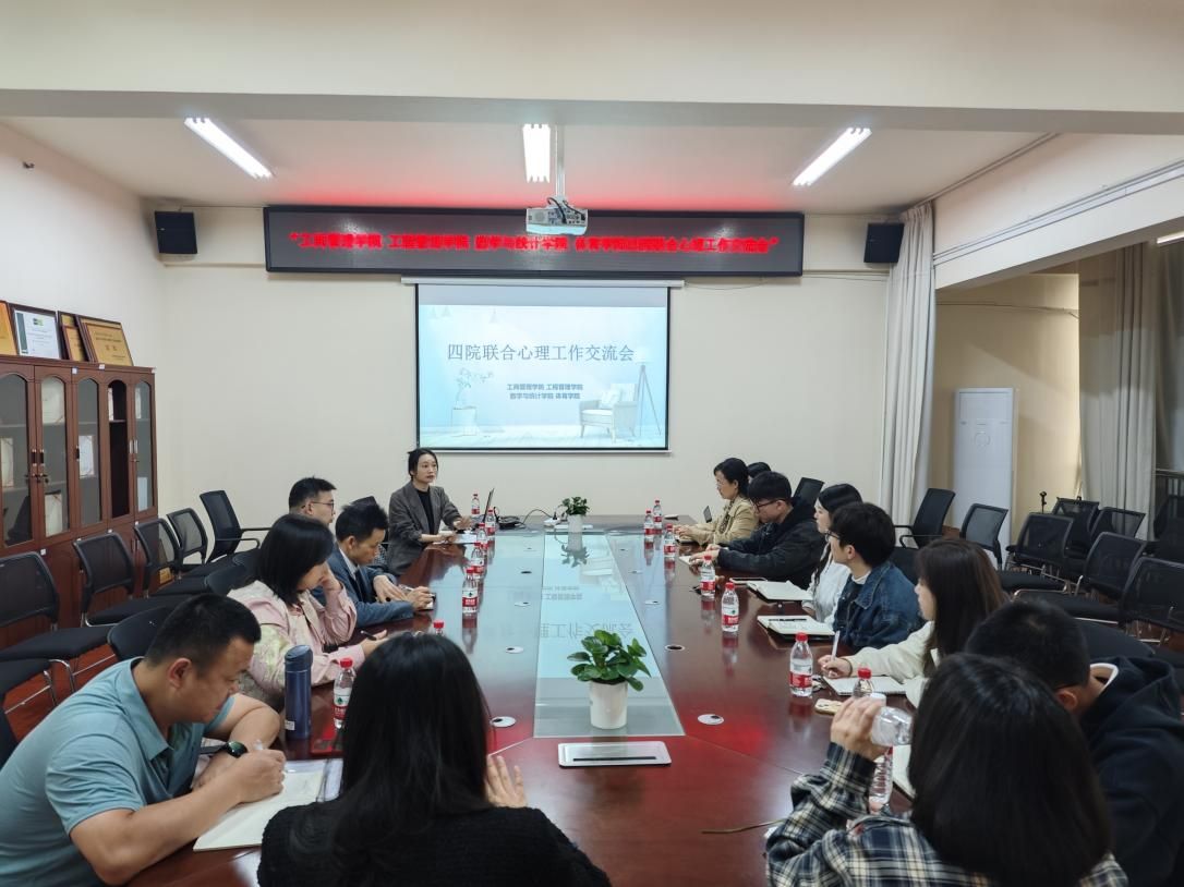 (本网讯)为进一步提高各学院心理健康工作能力与管理水平,全面加强和改进心理健康工作,提升辅导员心理育人工作实效,4月11日上午,工程管理学院与工商管理学院、数学与统计学院、体育学院在办公楼414开展心理工作交流会。本次会议由Beat365心理健康中心周彩萍老师主持,工商管理学院党委书记郭丽、我院党委副书记刘绿丝、以及全体专兼职辅导员参加本次会议。