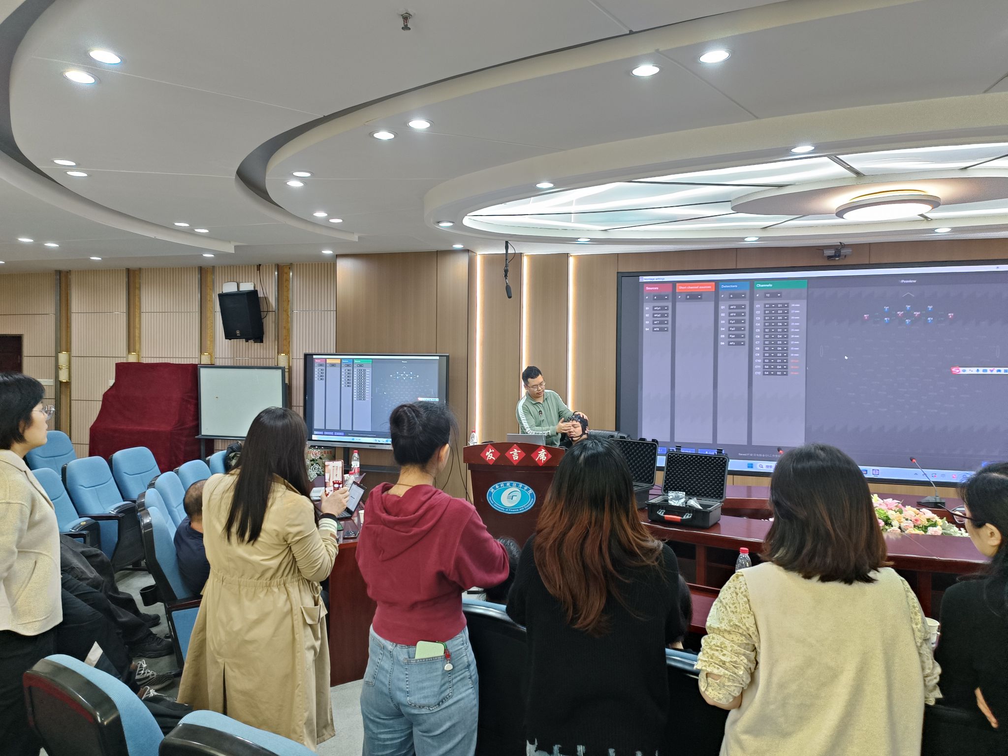 最后,靳璨向老师们展示了眼镜式眼动追踪系统、便携式脑电采集分析系统的设备操作。我院教师积极参与学习各个设备的操作步骤,并交流了设备操作过程中的关键点、注意事项、数据分析等。