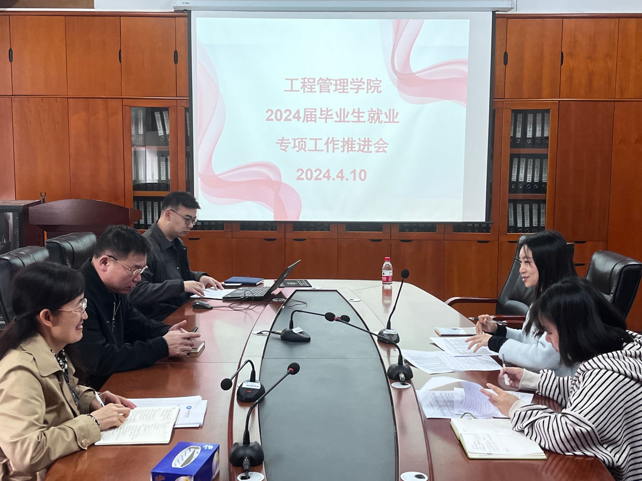 (本网讯)4月10日,工程管理学院在办公楼911会议室举行了就业工作推进会的第二次会议。会议由学院党委副书记刘绿丝主持,学院党委书记向占宏,学工办主任袁仕远以及毕业班辅导员傅艺娜、周彩萍参加了会议。