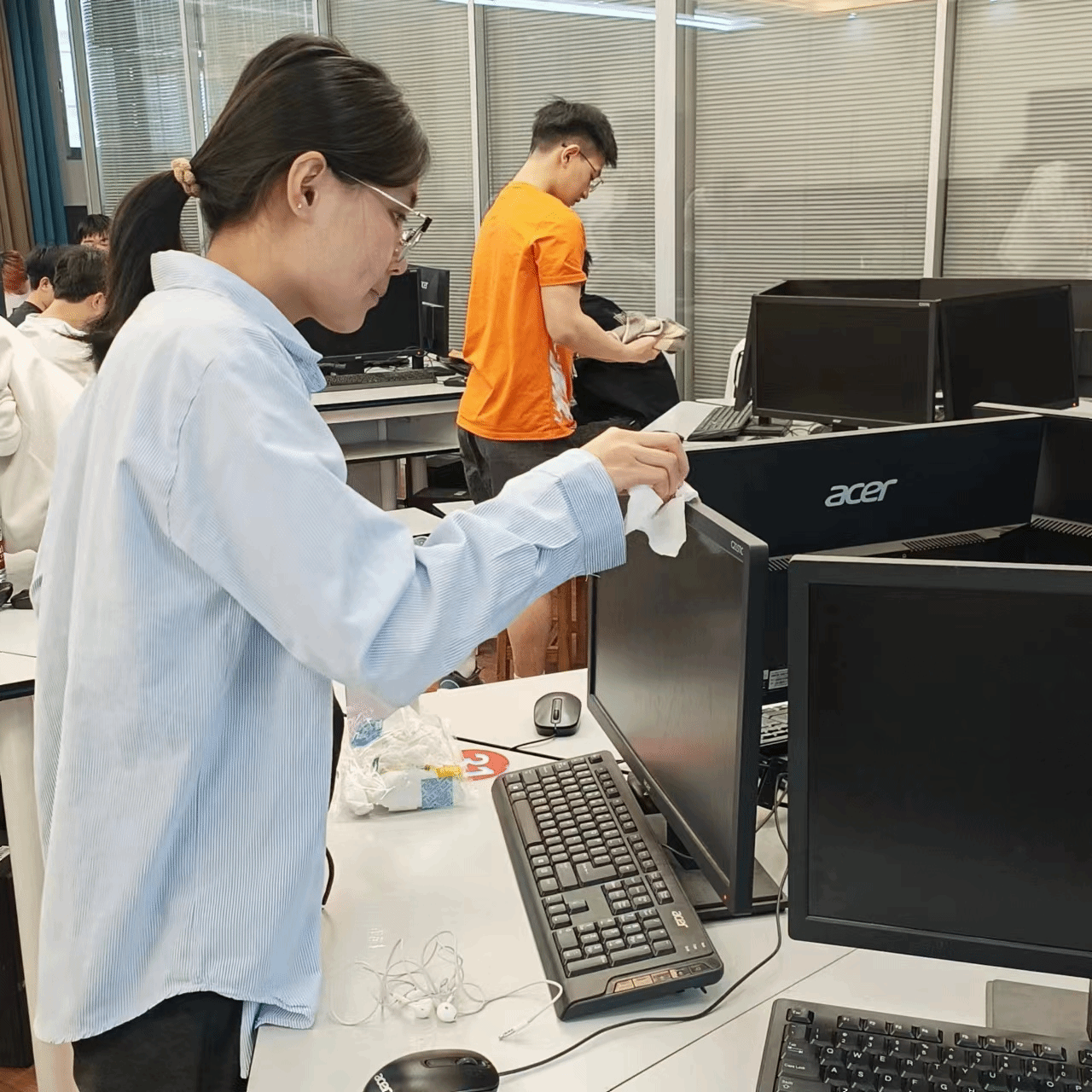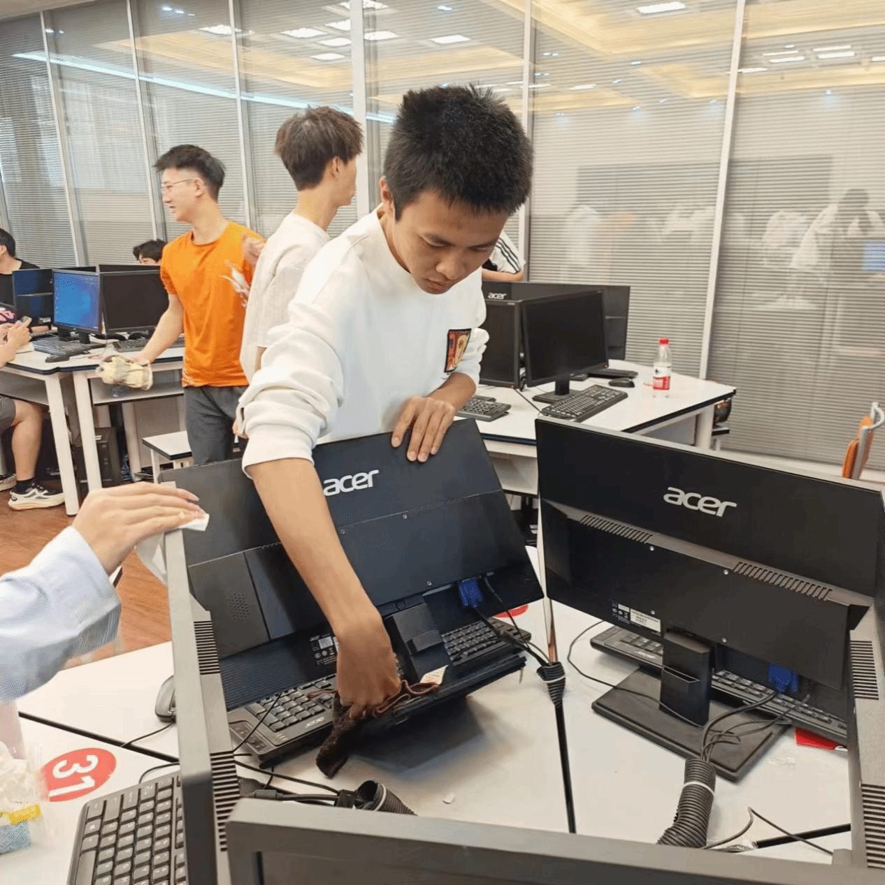 图:学子们对电脑主机进行深度除尘,展现精益求精的专业素养