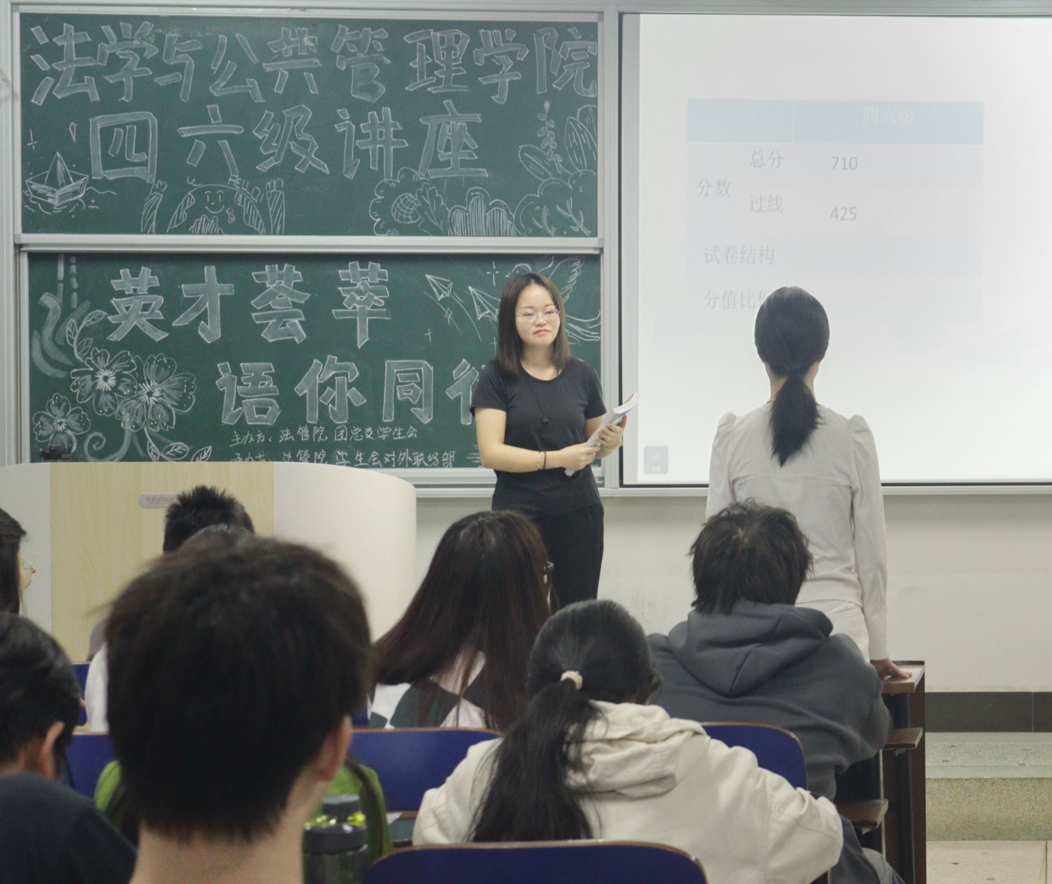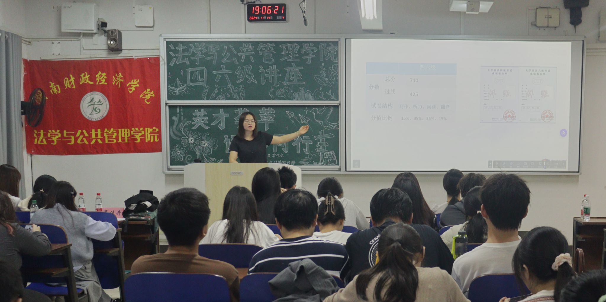 (本网讯)为进一步指导同学们科学备考大学英语四六级考试,11月14日,法学与公共管理学院于主校区3201教室举办大学英语四六级考试的备考讲座。讲座特邀英语培训教师夏佳卉主讲,50余名同学参与本次活动。