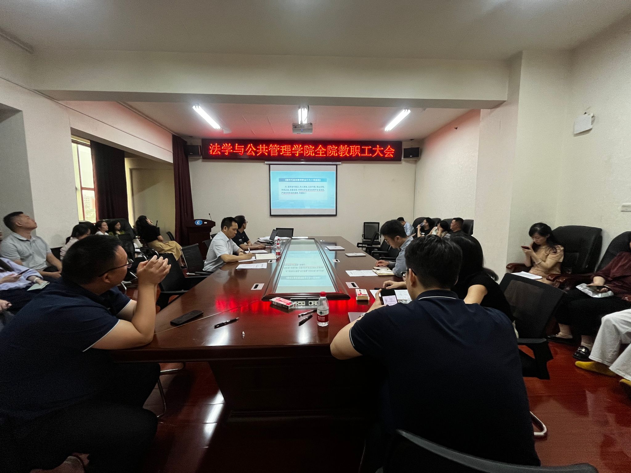 (本网讯)为进一步强化教师职业道德建设,营造风清气正的教育生态,5月14日下午,法学与公共管理学院在办公楼414-2会议室召开师德师风专项学习会议。会议由学院党委副书记李茂华主持,全体教职工参加学习。