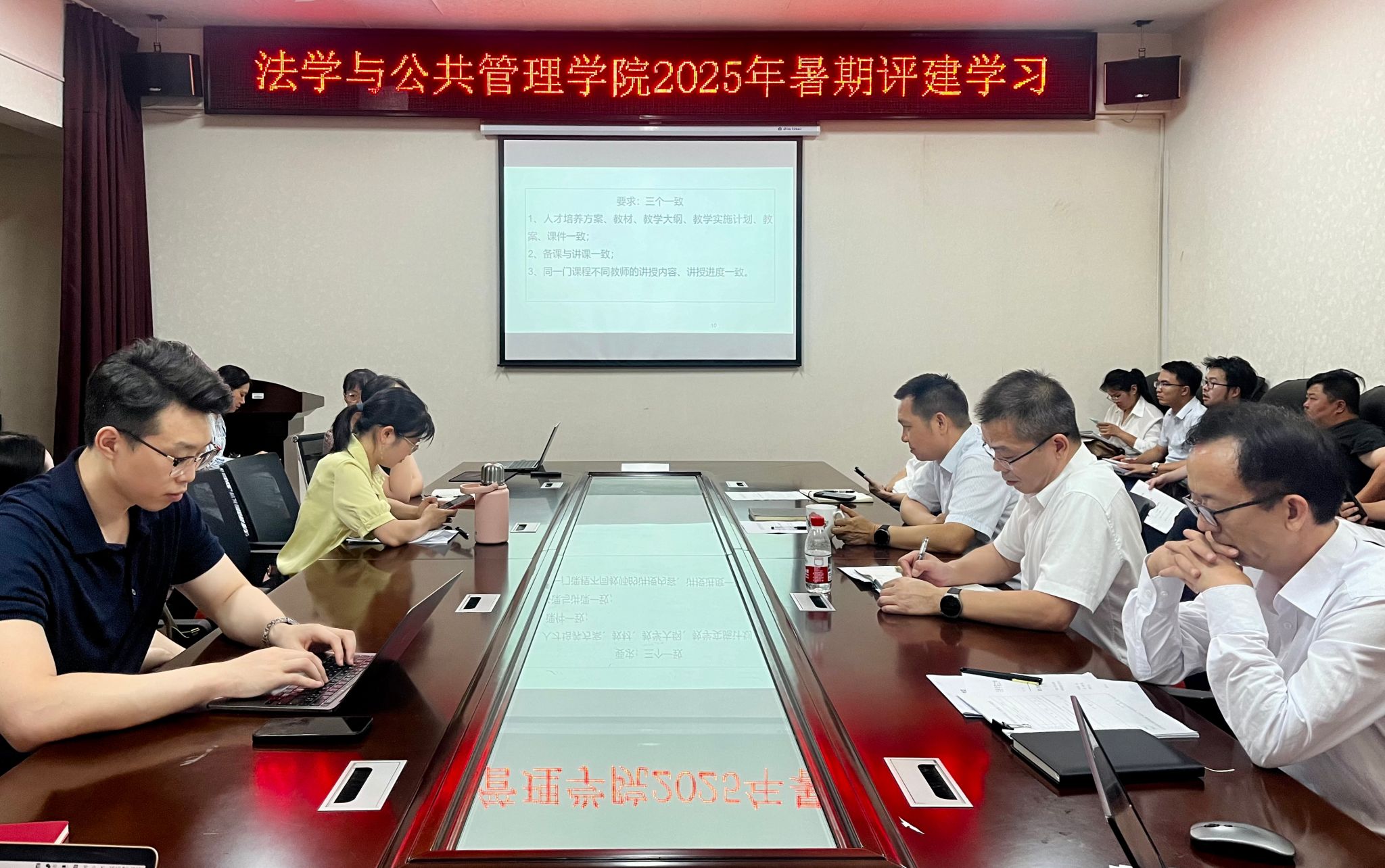 (本网讯)7月2日下午,法学与公共管理学院在办公楼414-2会议室召开暑期评建工作专题会议,全面部署本科教育教学审核评估准备工作。会议由学院党委副书记李茂华主持,全体教职工参加。
