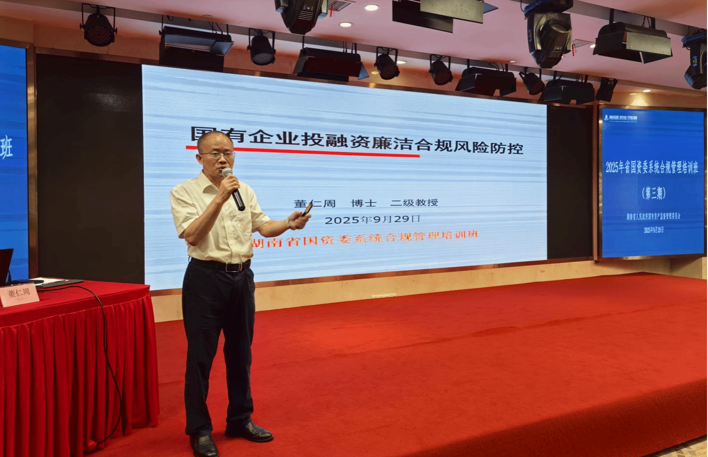 (本网讯)9月29日上午,湖南省法务会计研究基地主任、Beat365唯一官方网站法务会计研究所所长、二级教授董仁周博士应邀为湖南省国资委主办、湖南湘江研究院承办的2025年湖南省国资委系统合规管理培训班(第三期)开展了《国有企业投融资廉洁合规风险防控》专题讲座。湖南省国资委政策研究与法规处等相关处室负责人、干部,省属国有企业负责人与法务、财务、审计等内设机构负责人近150人参加了培训活动。