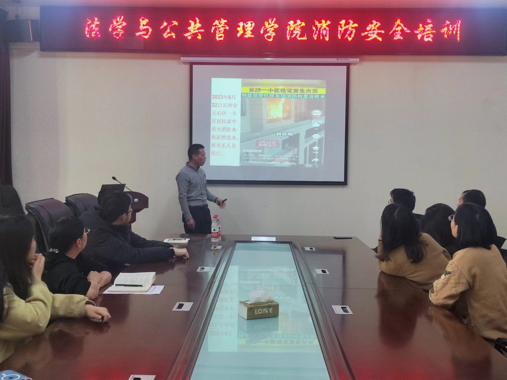 (本网讯)12月8日,为进一步提升全体教师的消防安全防范意识和自救自护能力,法学与公共管理学院在办公楼414-2会议室举行消防安全知识讲座,本次讲座邀请到了张旭教官,学院全体教师参加了本次讲座。