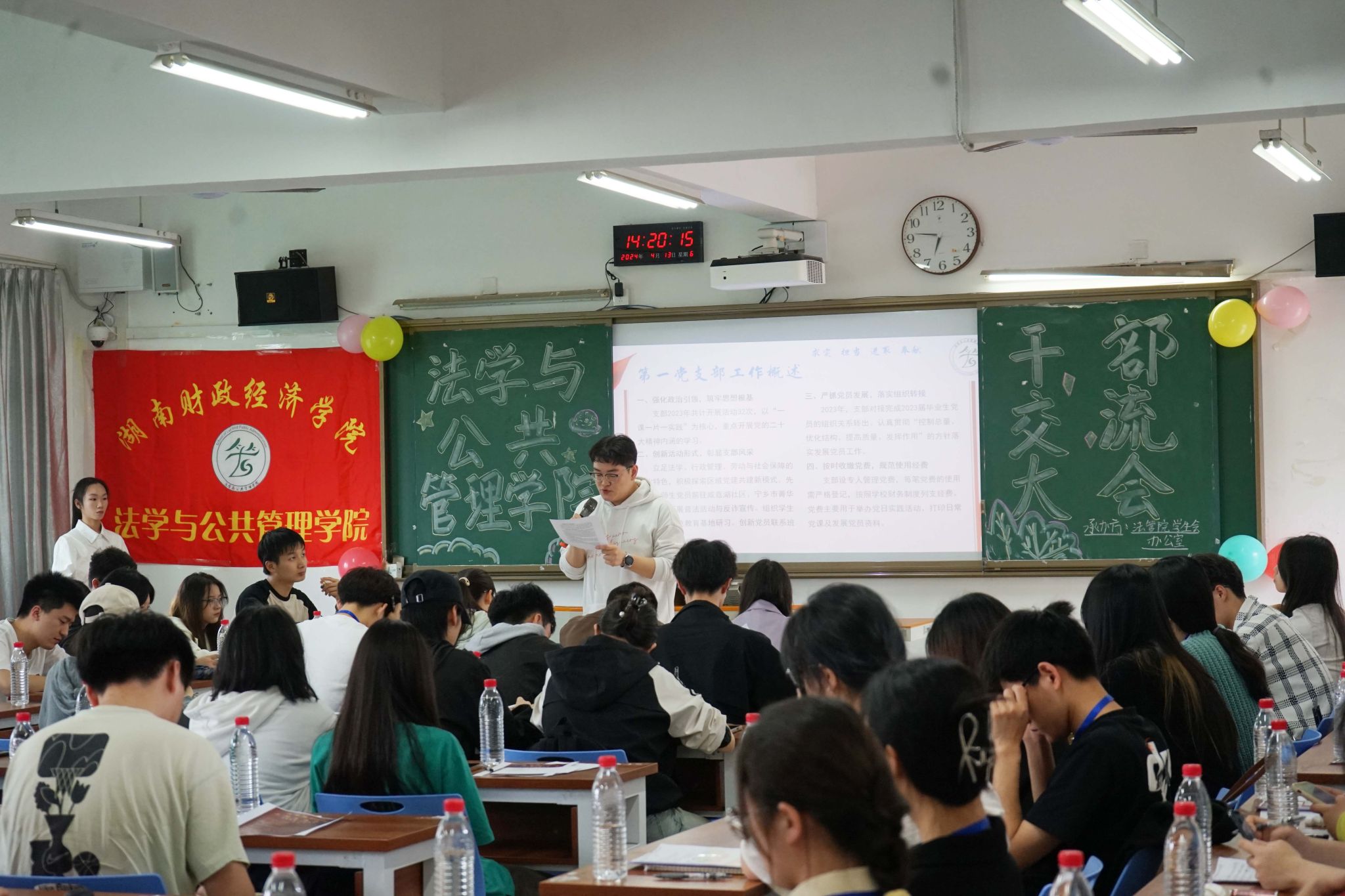 (本网讯)为加强学生干部队伍建设,4月13日,法学与公共管理学院在主校区3501教室开展学生干部交流大会。团总支书记张伊昌出席。学院学生党支部、团总支学生会及2021-2023级各班级学生干部代表共计90余人参加。