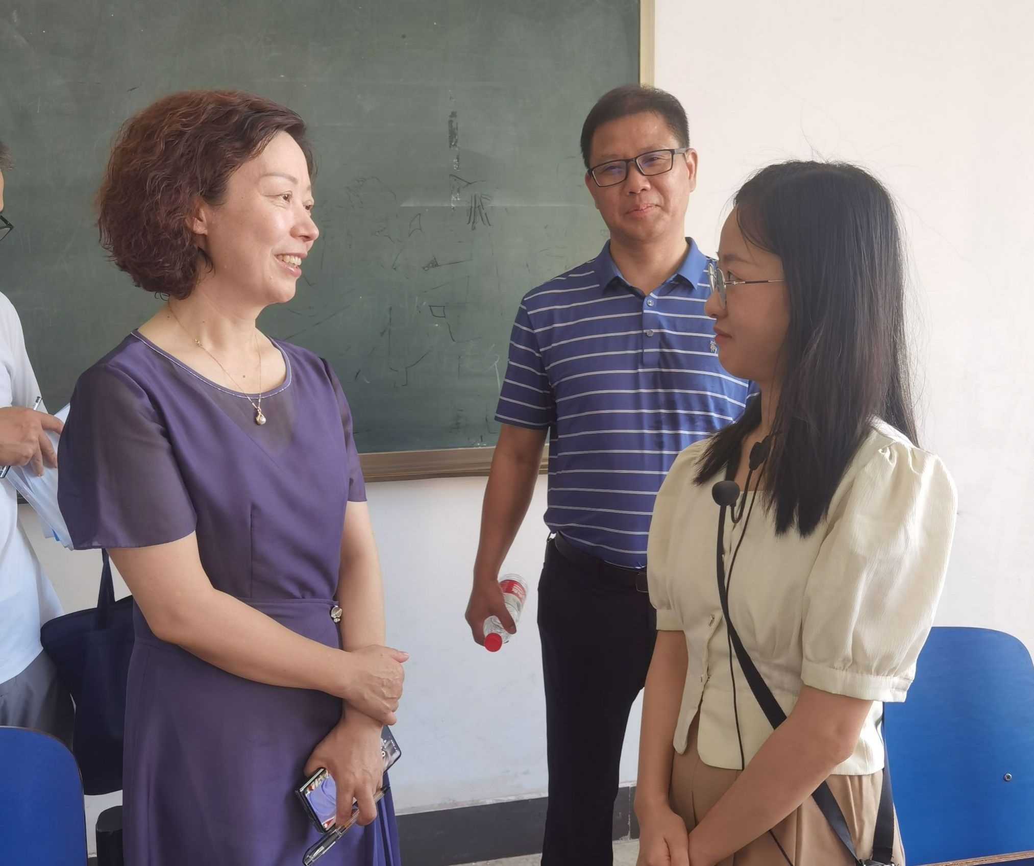 校党委书记杨兰英(左)听课后与任课教师交流