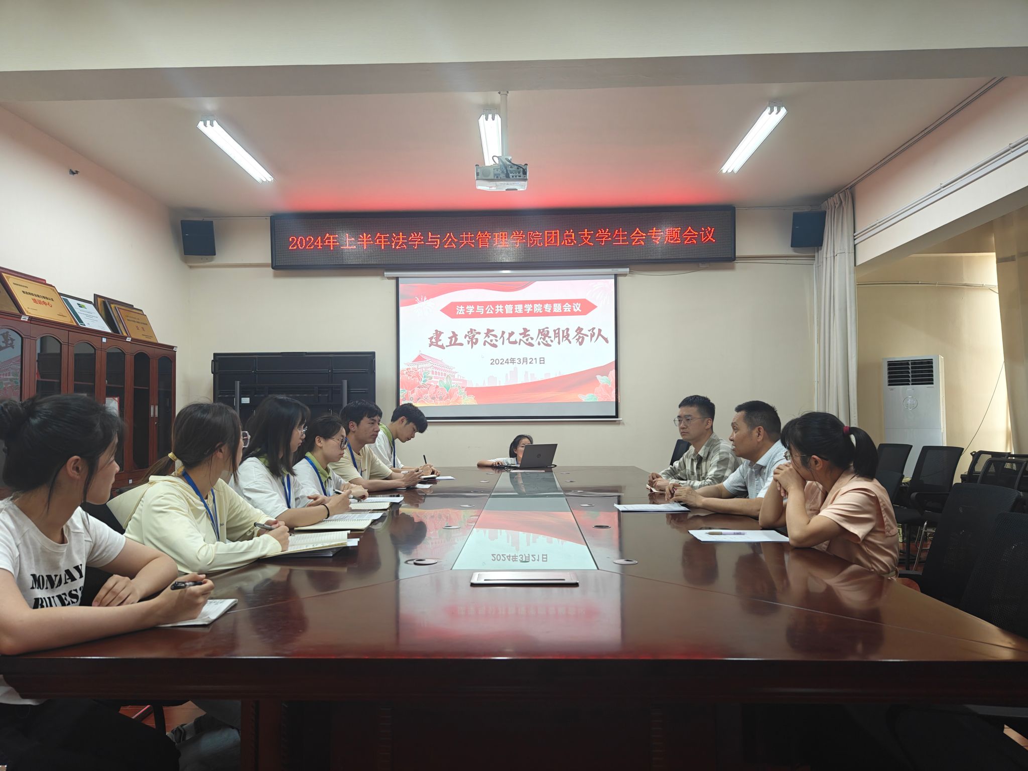 (本网讯)为进一步推进团学工作改革,更好地提升团学工作实效,5月15日,法学与公共管理学院在办公楼414-1会议室召开了2024年上半年团总支学生会专题会议。学院党委副书记李茂华、学工办主任彭兰莅临指导。团总支书记张伊昌主持,团总支副书记、学生会主席团成员及主要学生干部共计10人参会。