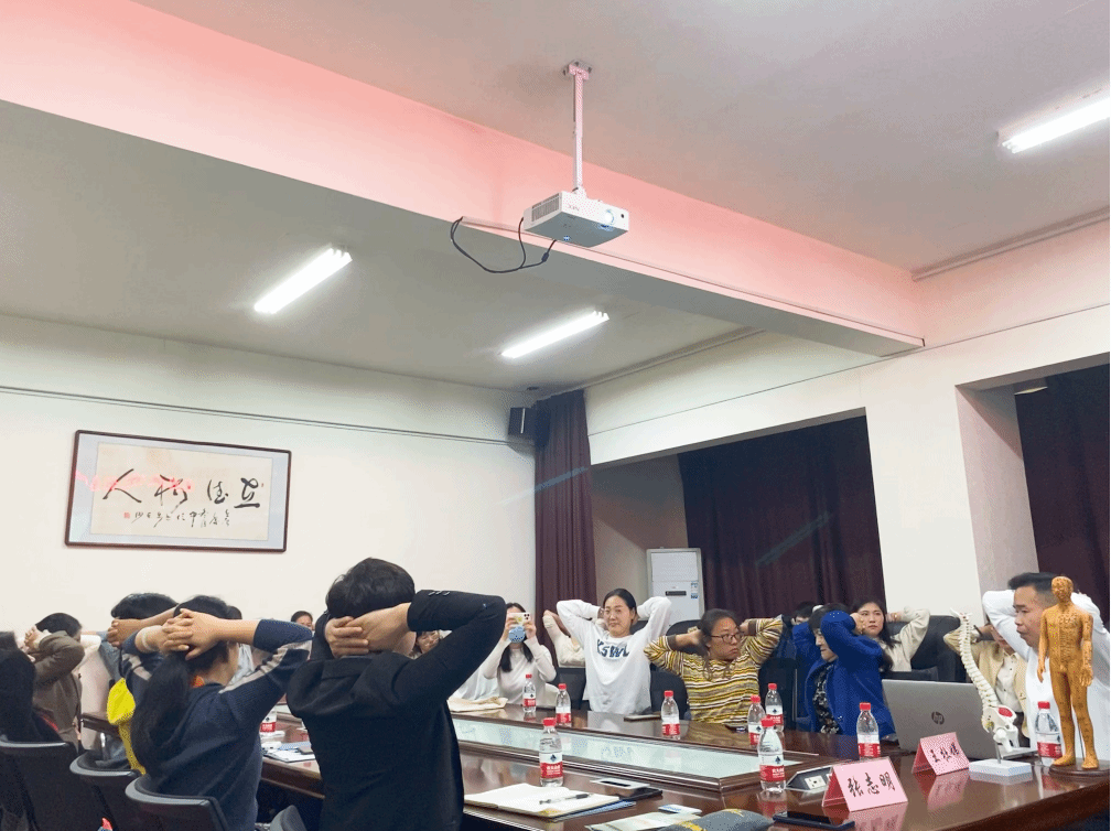 张志明教授结合日常生活中的真实案例,运用丰富的工作经验和医学知识,生动地讲解了有关颈椎和腰椎的保健知识。谈笑间,诠释生命与健康的奥秘,时不时得到教职员工的阵阵掌声。随后张教授现场带领教职工学习了一套肩颈腰椎保健操和穴位按摩法,现场的教职员工边学边做,亲身感受保健操和穴位按摩带来的功效。