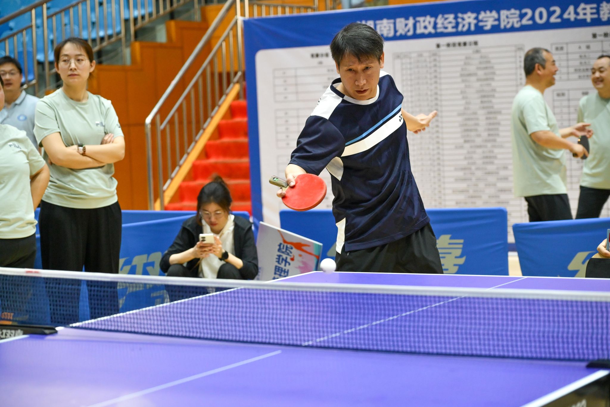 赛场上,参赛选手各种花式炫技将横拍、直拍、削球、扣杀、旋球等技巧表现得淋漓尽致,多回合拉锯的精彩场面不断上演,比分交替上升,整个比赛紧张激烈、扣人心弦,现场洋溢着热闹喜庆的气氛,充分展示了广大教职工顽强、拼搏的体育运动精神。在一旁的观战区,教师们也抑制不住内心的激动,高声为选手们加油打气……小小的乒乓球,“乒”来“乒”去,“乒”出活力,“乓”出友谊!“乒”出健康、“乒”出快乐!