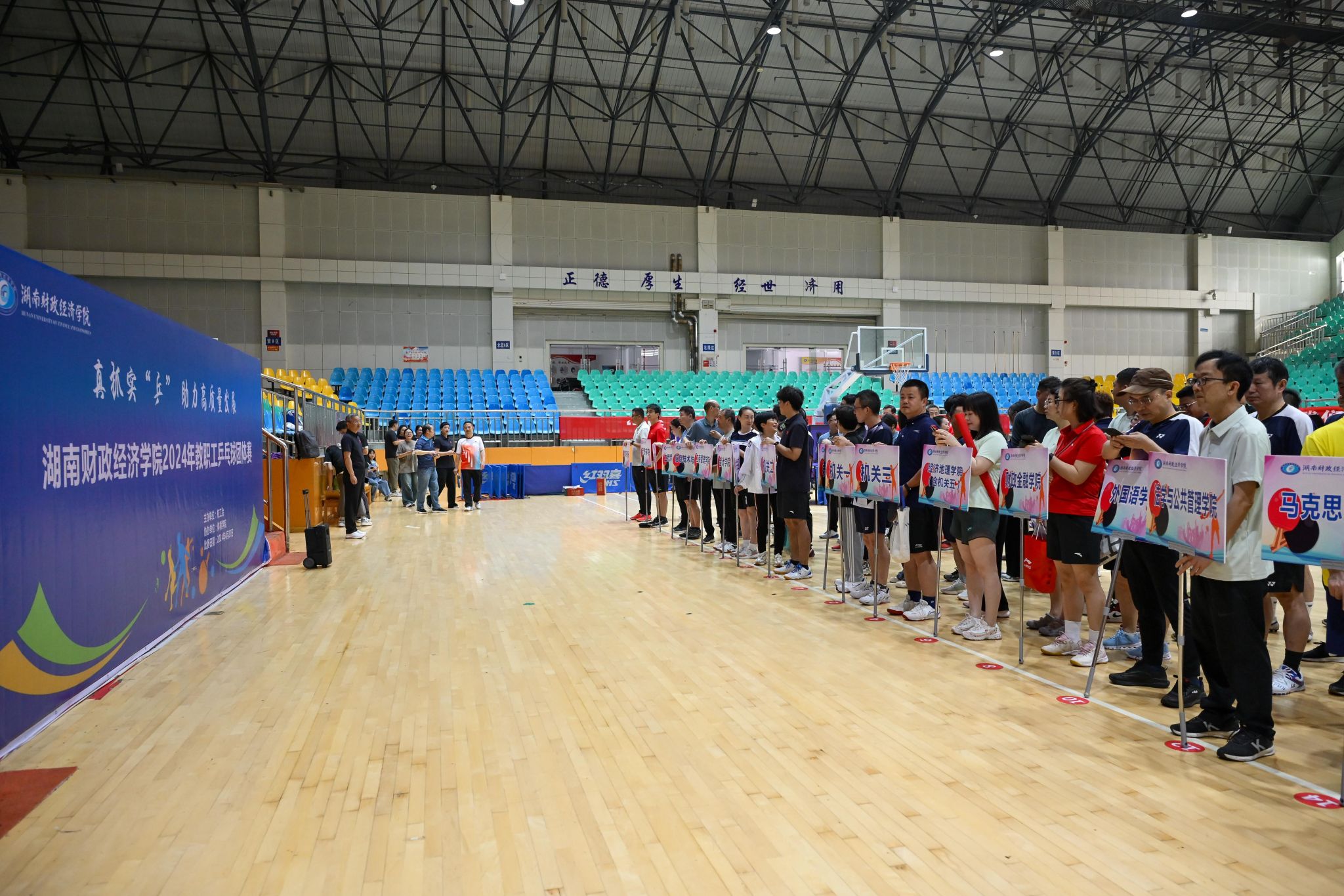 (本网讯)为进一步丰富教职工的校园文化生活,增强体质,加强交流,凝聚合力,形成高质量发展的共识。4月27日,2024年Beat365唯一官方网站教职工乒乓球团体赛在主校区体育馆主馆举行。本次赛事为期1天,由校工会主办,体育学院协办,来自全校18各分工会的运动员齐聚一堂,角逐乒坛。副校长、工会主席刘钟理出席开幕式并致辞。