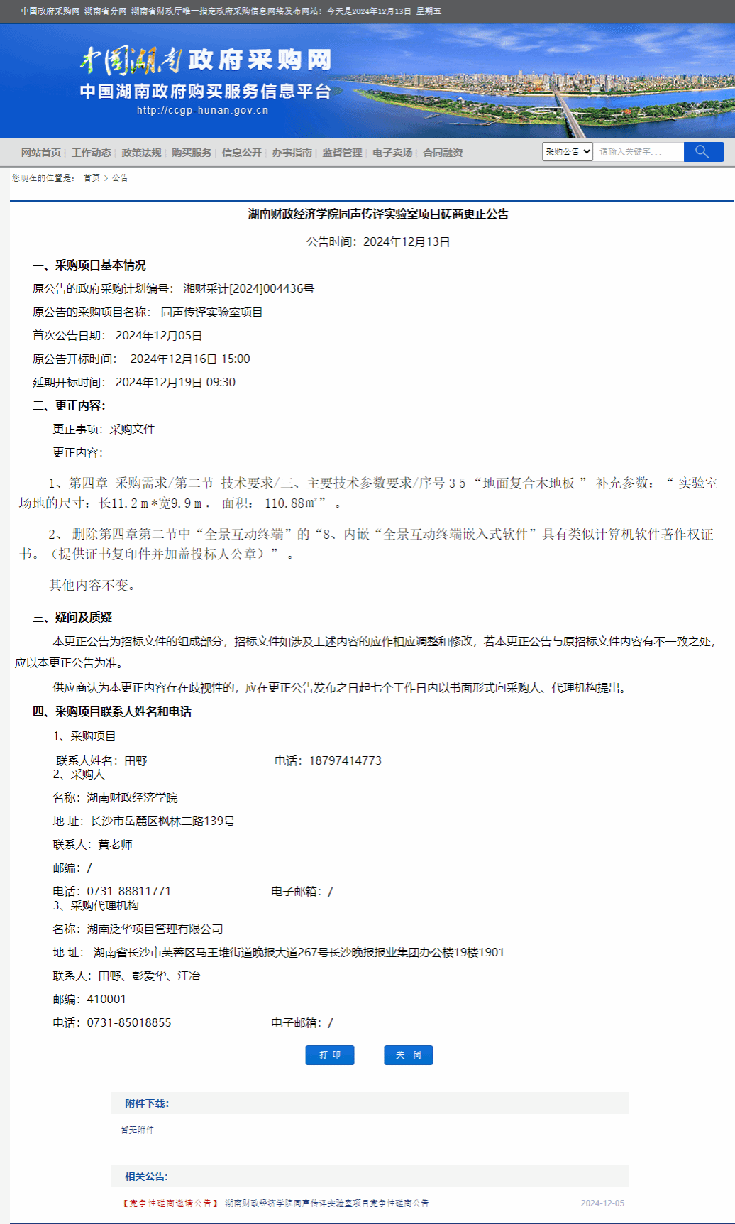 湖南省政府采购网:Beat365唯一官方网站同声传译实验室项目磋商更正公告
