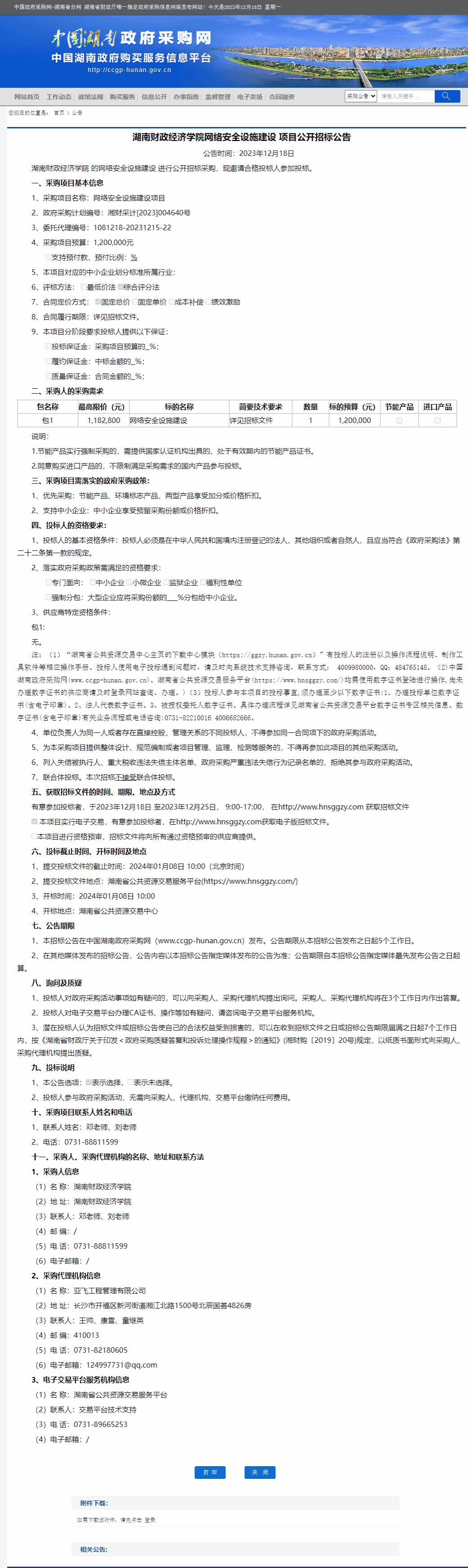 湖南省政府采购网:Beat365唯一官方网站网络安全设施建设项目公开招标公告