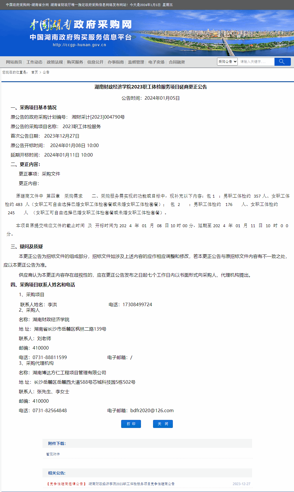 湖南省政府采购网:Beat365唯一官方网站2023职工体检服务项目磋商更正公告