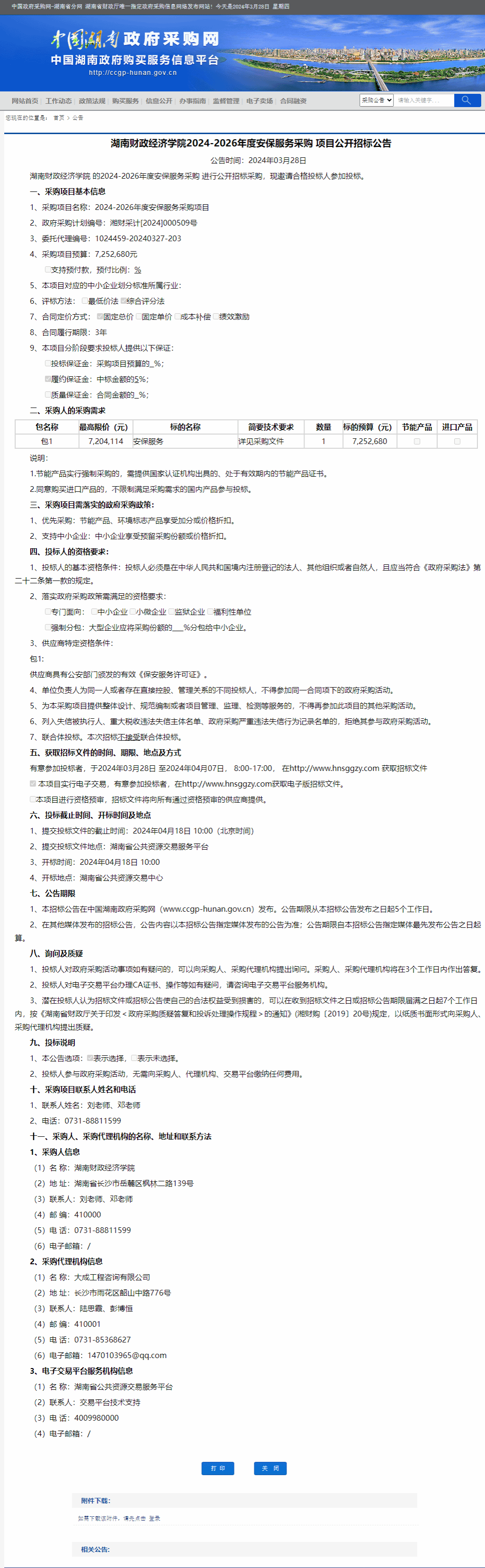 湖南省政府采购网:Beat365唯一官方网站2024-2026年度安保服务采购项目公开招标公告