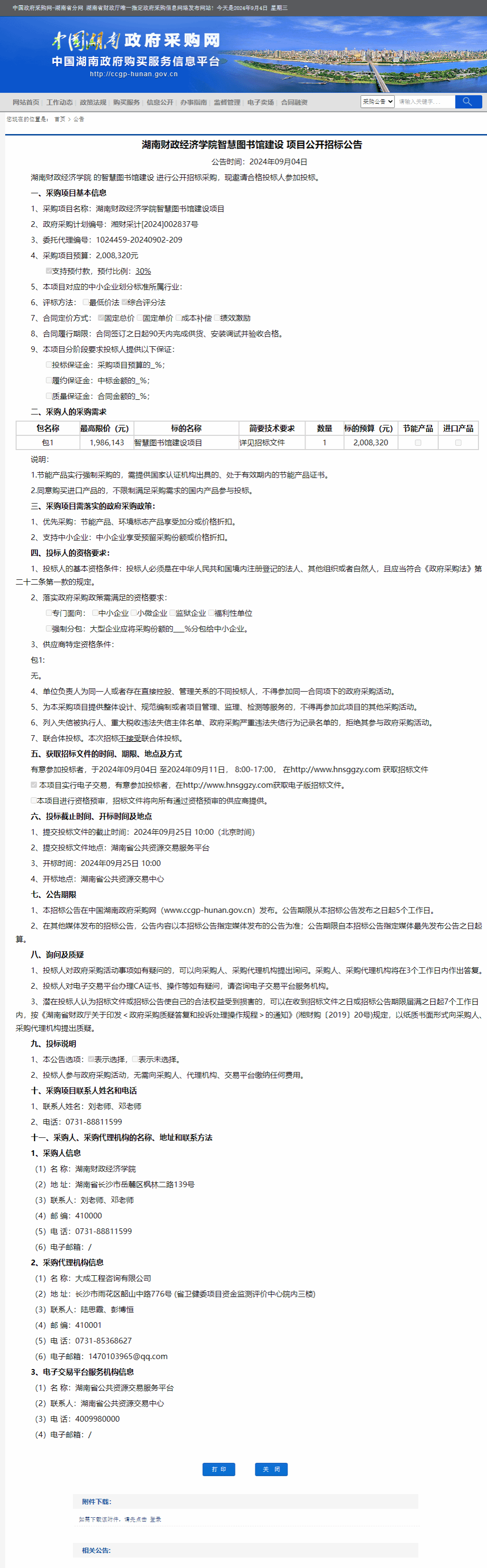 湖南省政府采购网:Beat365唯一官方网站智慧图书馆建设项目公开招标公告