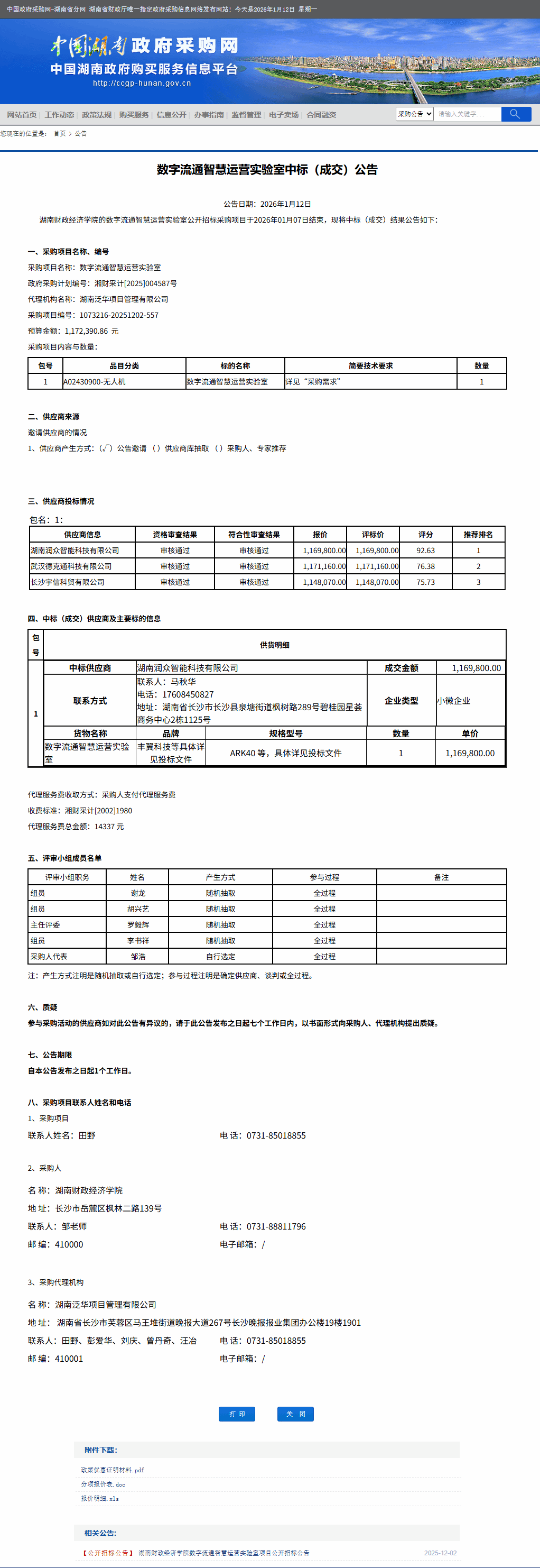 湖南省政府采购网:Beat365唯一官方网站数字流通智慧运营实验室中标(成交)公告