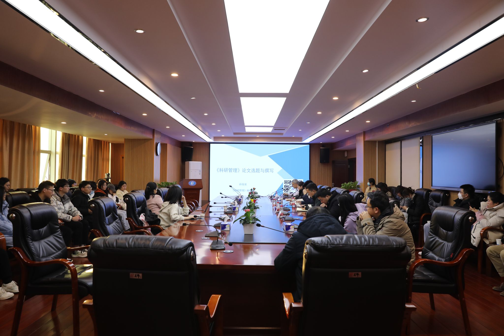 在为时两个小时左右的讲座中,薛俊波首先就《科研管理》的办刊宗旨、所获荣誉、当前关注的重要方向和主要栏目、审稿流程等进行了介绍与分享;薛俊波指出,文章合为时而著,优秀论文选题应该契合中央精神和社会大潮观点,他建议大家从宏观着眼,细处入手,大主题下的小切入。接着,薛俊波聚焦论文撰写具体要求,围绕标题、摘要、正文、和参考文献四个方面进行了深入说明。最后,结合自身多年的审稿经验,薛俊波从评审者角度,针对如何提高投稿命中率,给大家提了目录清晰、内容详略得当、注意结构完整等几点注意事项,同时也建议大家要注重把握和体会评审者的心理。