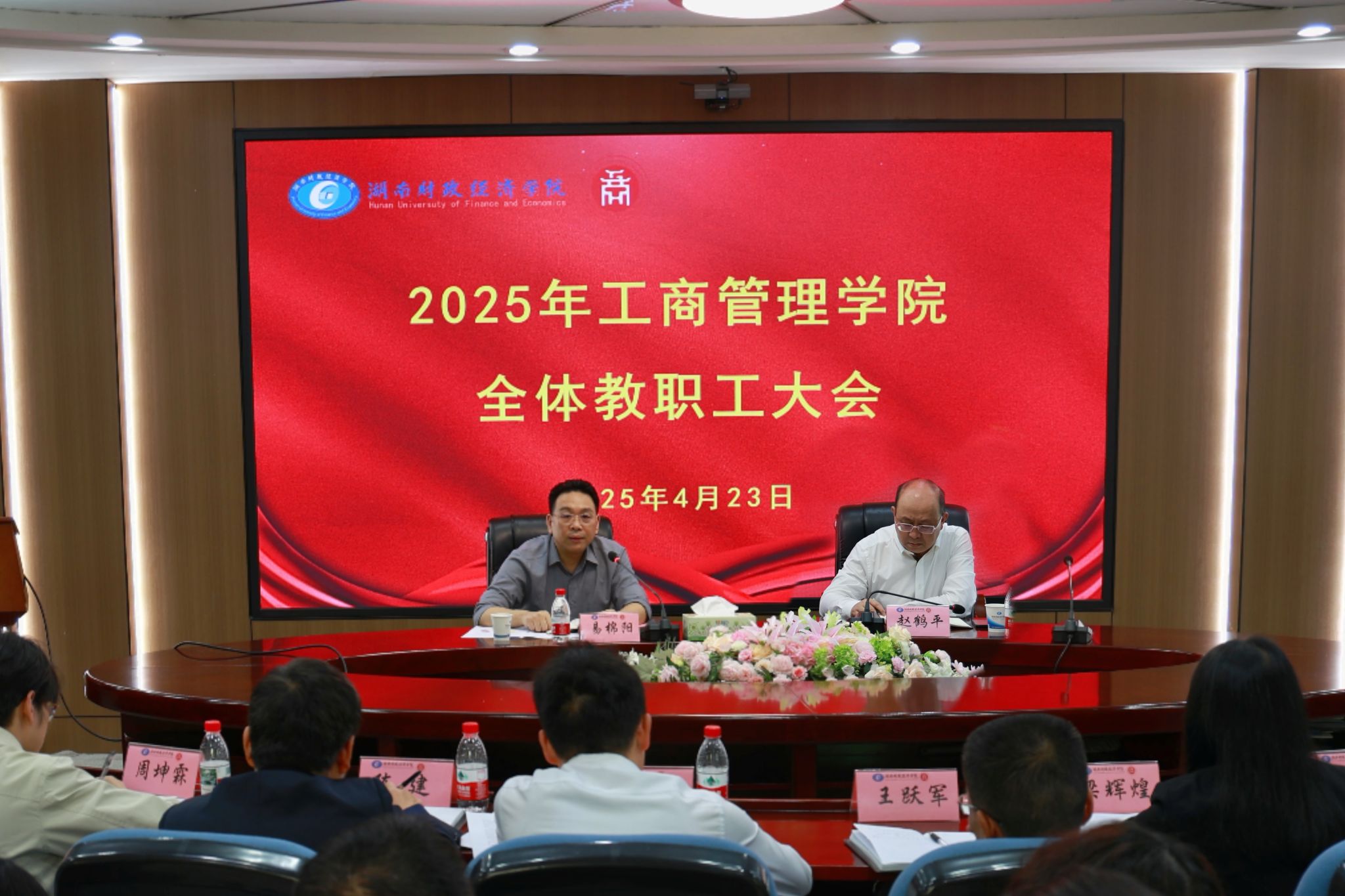 (本网讯)4月23日下午,工商管理学院在办公楼五楼视频会议室隆重召开全体教职工大会。校党委书记易棉阳出席会议并作重要讲话,党委委员、副校长赵鹤平主持会议。学院党政领导班子及全体教职工齐聚一堂,共商学院发展大计。