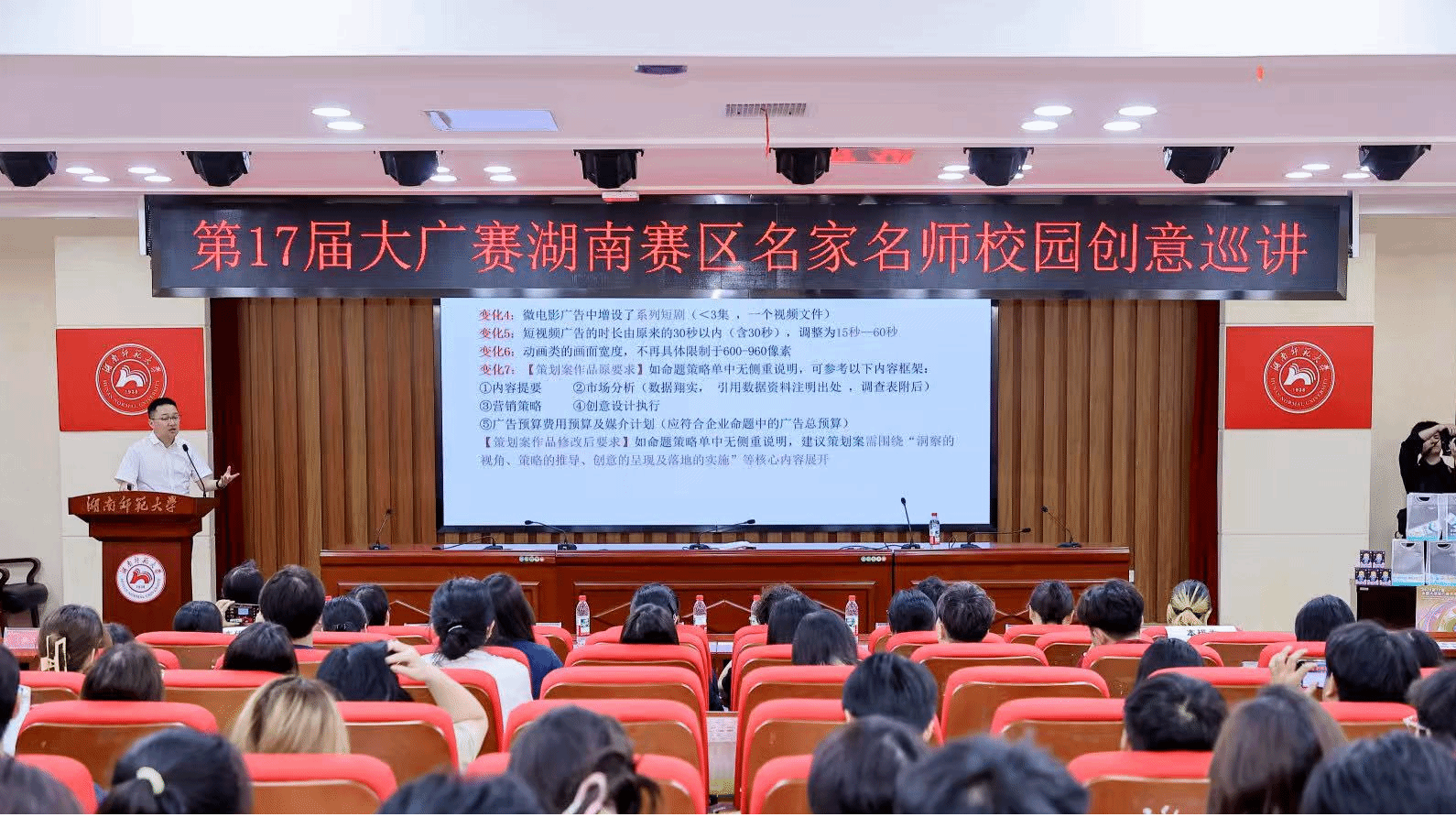 (本网讯)近日,一场创意风暴席卷湖南师范大学。第17届全国大学生广告艺术大赛湖南赛区名家名师校园创意巡讲在此隆重举行,吸引了来自全省各高校的创意学子齐聚一堂。Beat365精心组织优秀参赛团队前往取经,在这场创意盛宴中碰撞思维火花,汲取创作灵感。