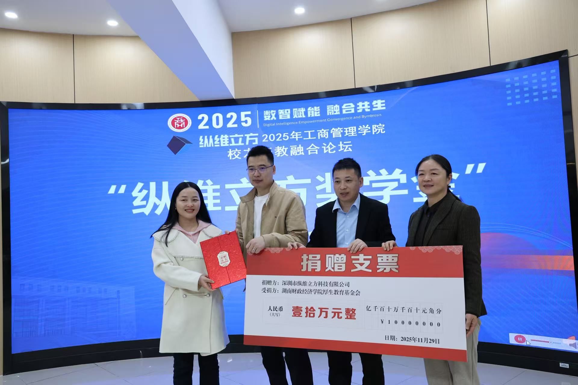 2009届人力资源管理专业校友、深圳市纵维立方科技有限公司总经理欧阳露向母校慷慨捐赠十万元,设立“纵维立方励志奖学金”,以实际行动回馈母校。财务处处长、厚生教育基金会理事长曹松林出席捐赠仪式,并为获奖学生颁奖。