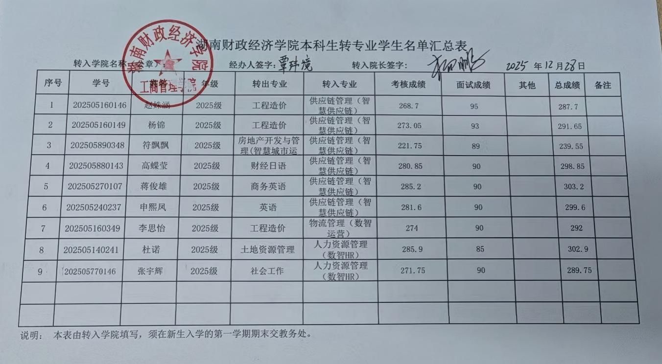 工商管理学院2025级本科生转专业拟同意转入名单公示表
