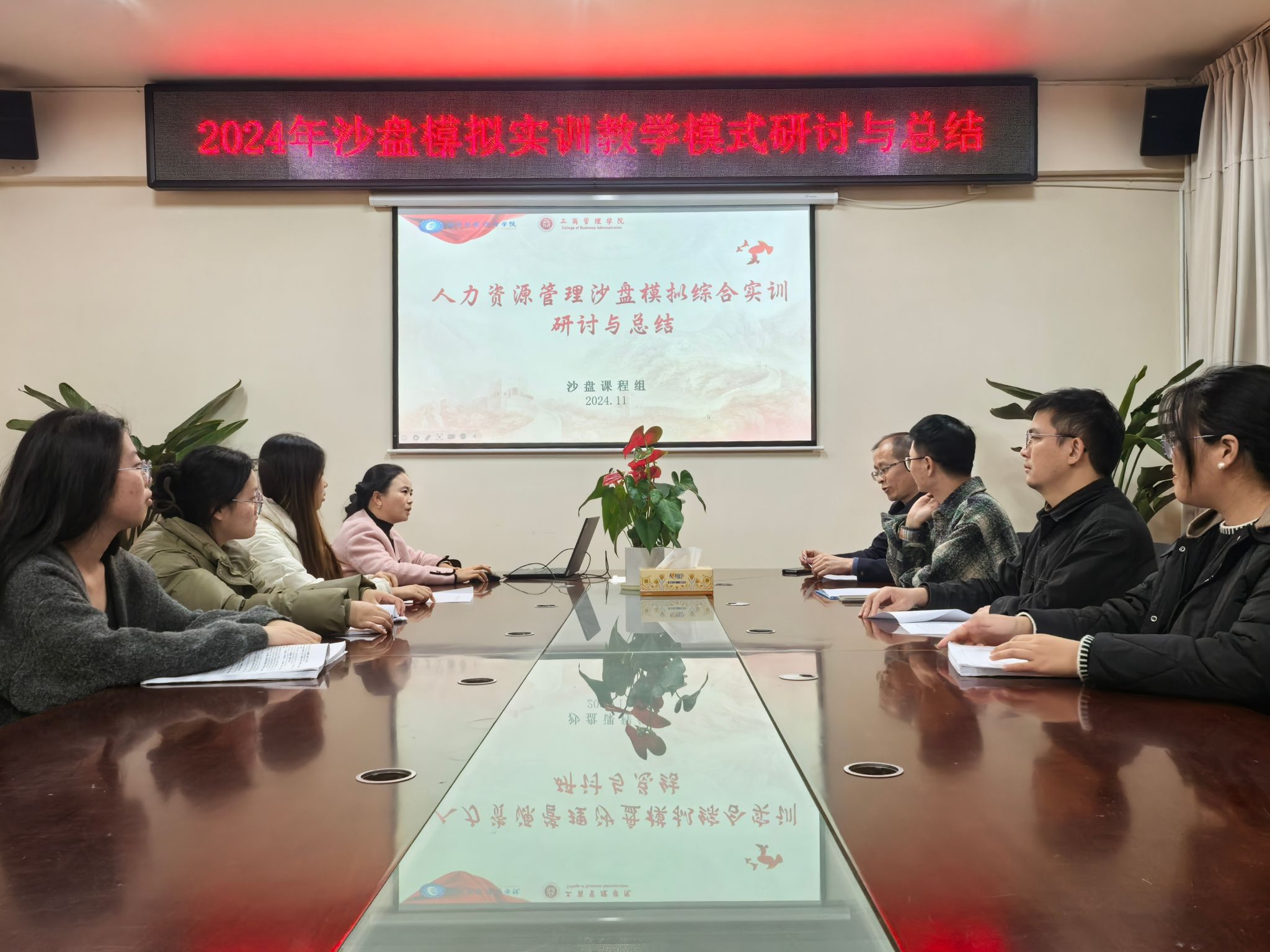 (本网讯)11月28日下午,工商管理学院在办公楼414-1会议室召开了“沙盘模拟体验式教学模式”研讨与总结会。会议由省一流课程《人力资源管理沙盘模拟综合实训》课程负责人廖玉玲老师主持。人力资源管理系教师黄波、邓华强、王一博、李芝山以及学生代表参加会议。