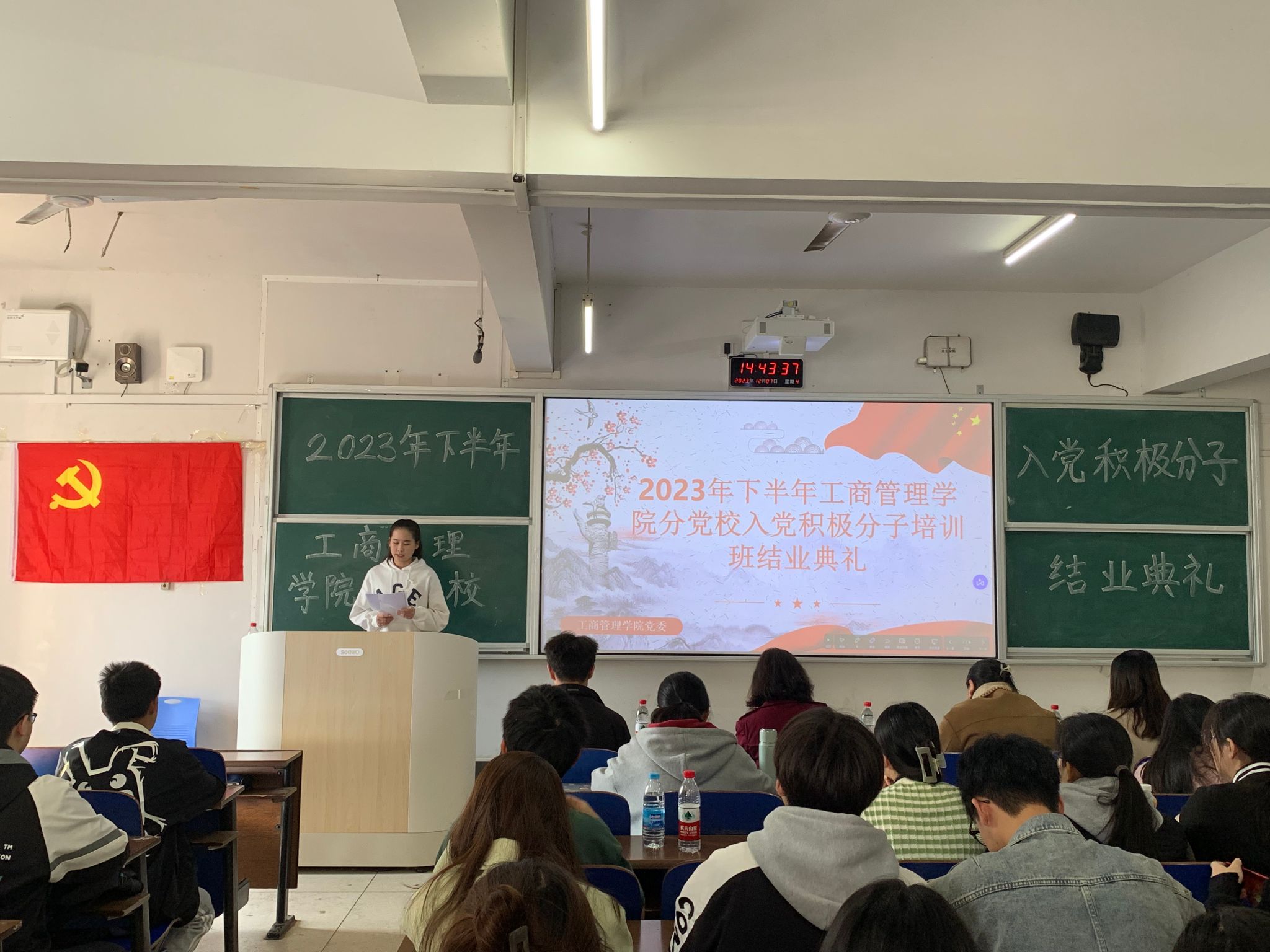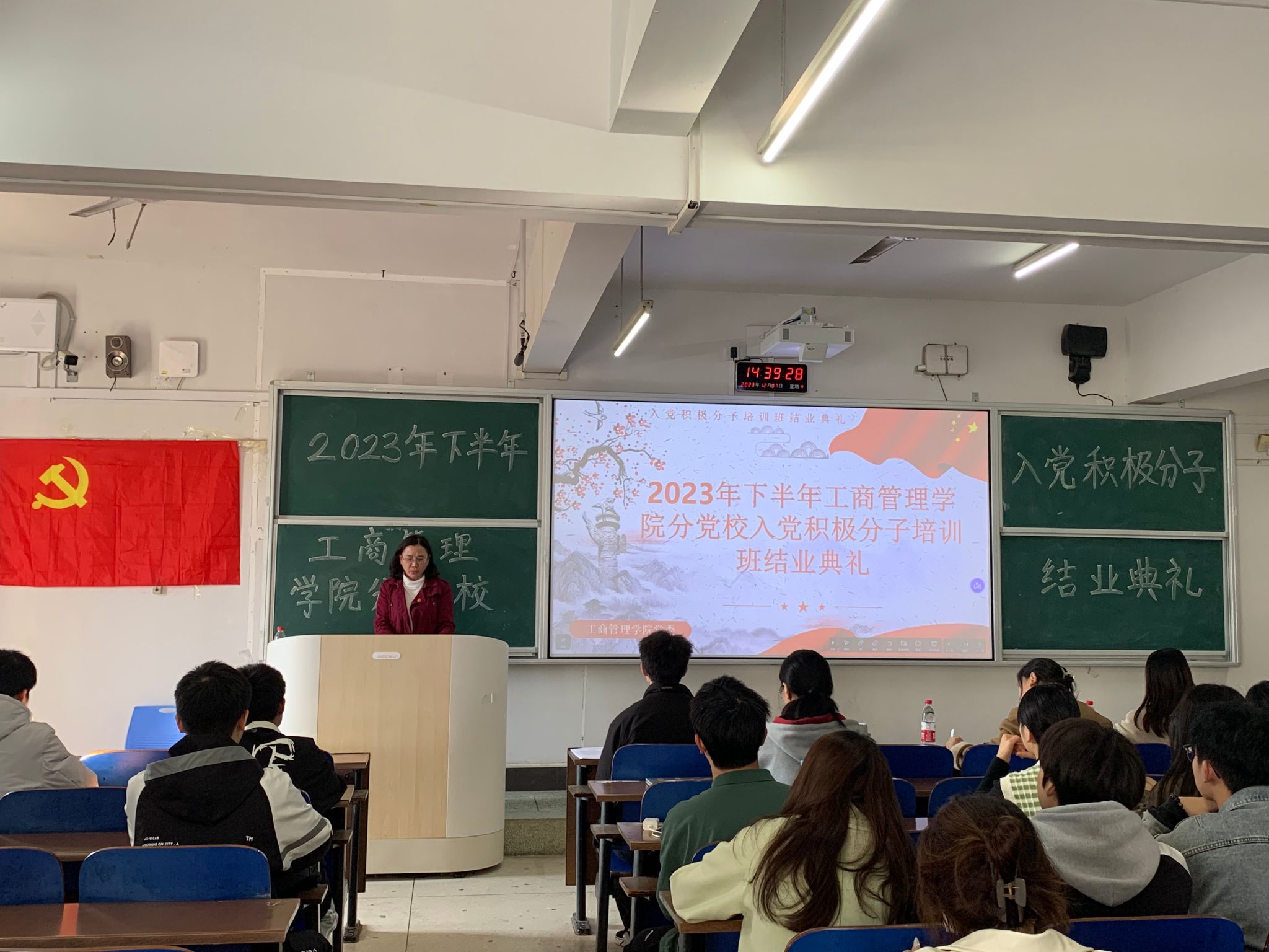 (本网讯)12月7日下午,工商管理学院分党校2023年第二期入党积极分子培训班结业典礼在第三教学楼3109教室顺利举行。工商管理学院党委书记郭丽、学工办主任肖艳娟、学生第一支部委员会书记王皓、学生第二支部委员会书记温嘉伟及三个学生党支部支委委员出席典礼,我院本期46名入党积极分子参会。本次典礼由学生第一支部委员会副书记张娟主持。
