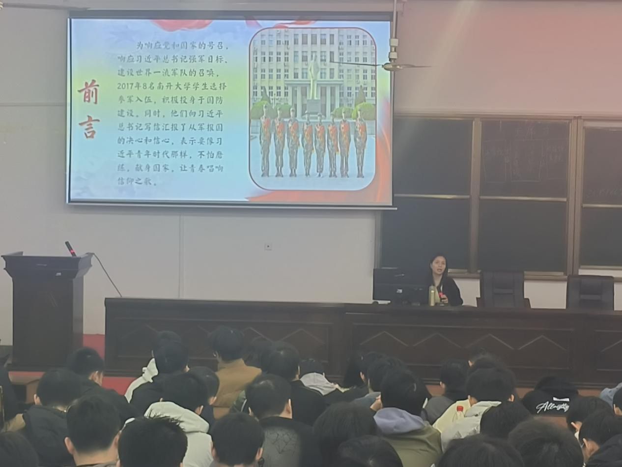 会上,学生工作部、武装部的熊弋帅老师为在场同学详细阐述了应征入伍的相关政策和流程。她不仅介绍了学费补偿、家庭优待金、津贴工资以及退役后的就业保障等实际利益,还就报名、体检、政审等关键环节进行了细致解答,有效消除了同学们的疑虑。熊老师结合当前国际形势,深刻剖析了大学生应征入伍的重要性和紧迫性,呼吁同学们将个人理想融入国家发展大局,为国家的繁荣富强贡献青春力量。