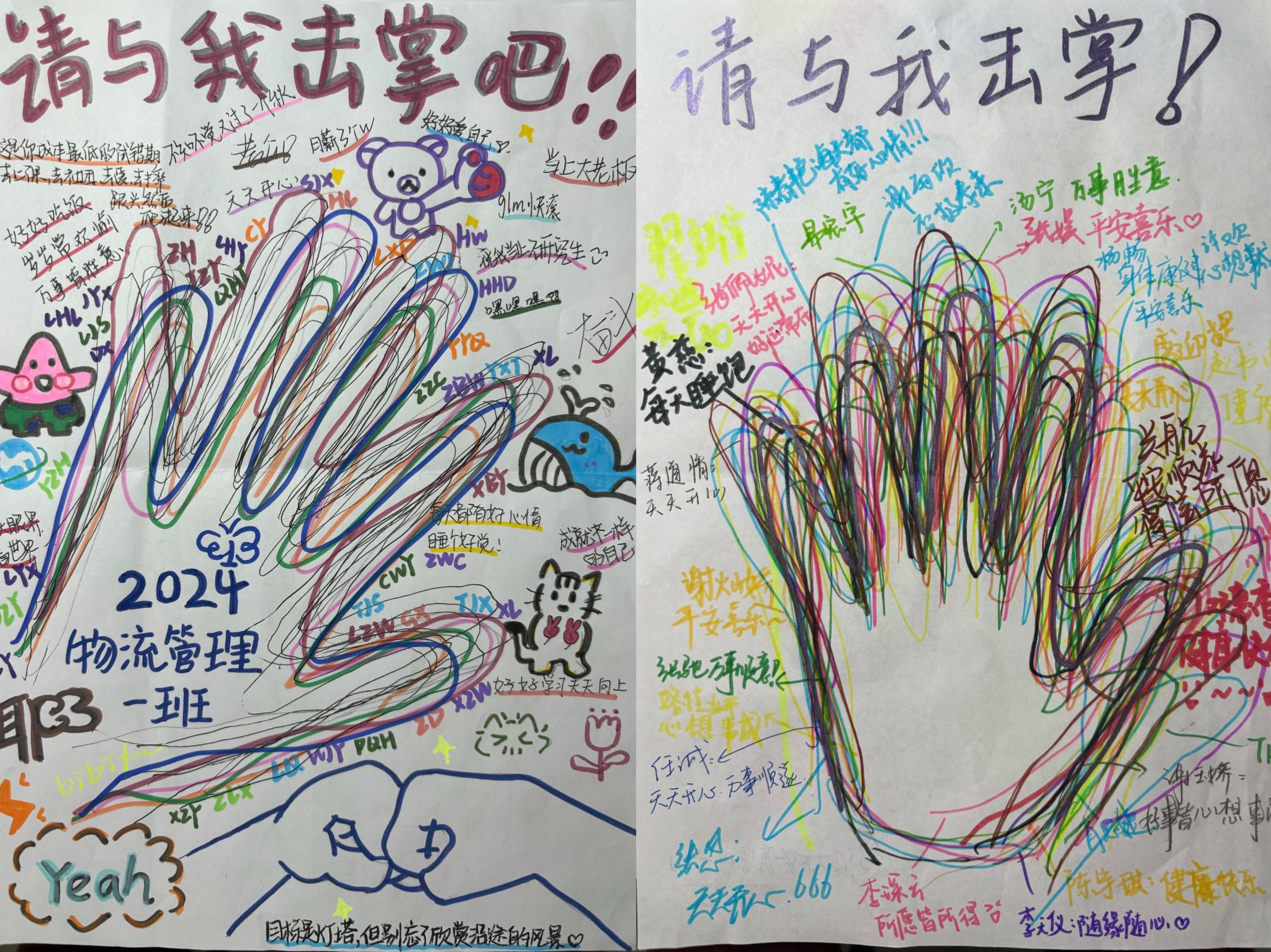 活动以班级为单位开展,同学们在A4纸上描绘手掌轮廓,书写“请与我击掌”的主题标语,并在班级中传递作品,互相写下心愿与祝福。一幅幅作品,色彩斑斓、文字真挚,不仅展现了同学们的创意与热情,更成为连接心灵的温暖桥梁,传递着支持与力量。