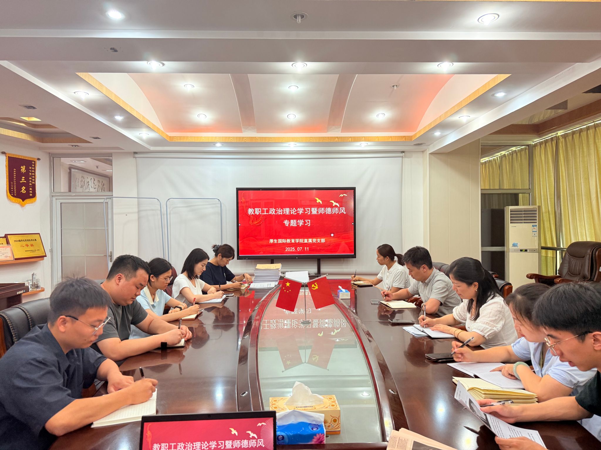 为进一步加强教师思想政治建设,提升师德师风水平,7月11日,国际合作与交流处、厚生国际教育学院组织全体教职工开展政治理论学习暨师德师风专题学习活动。本次学习聚焦习近平总书记关于教育的重要论述,以及学校重要事项审批流程规范,旨在引导教师坚守教育初心,落实立德树人根本任务。