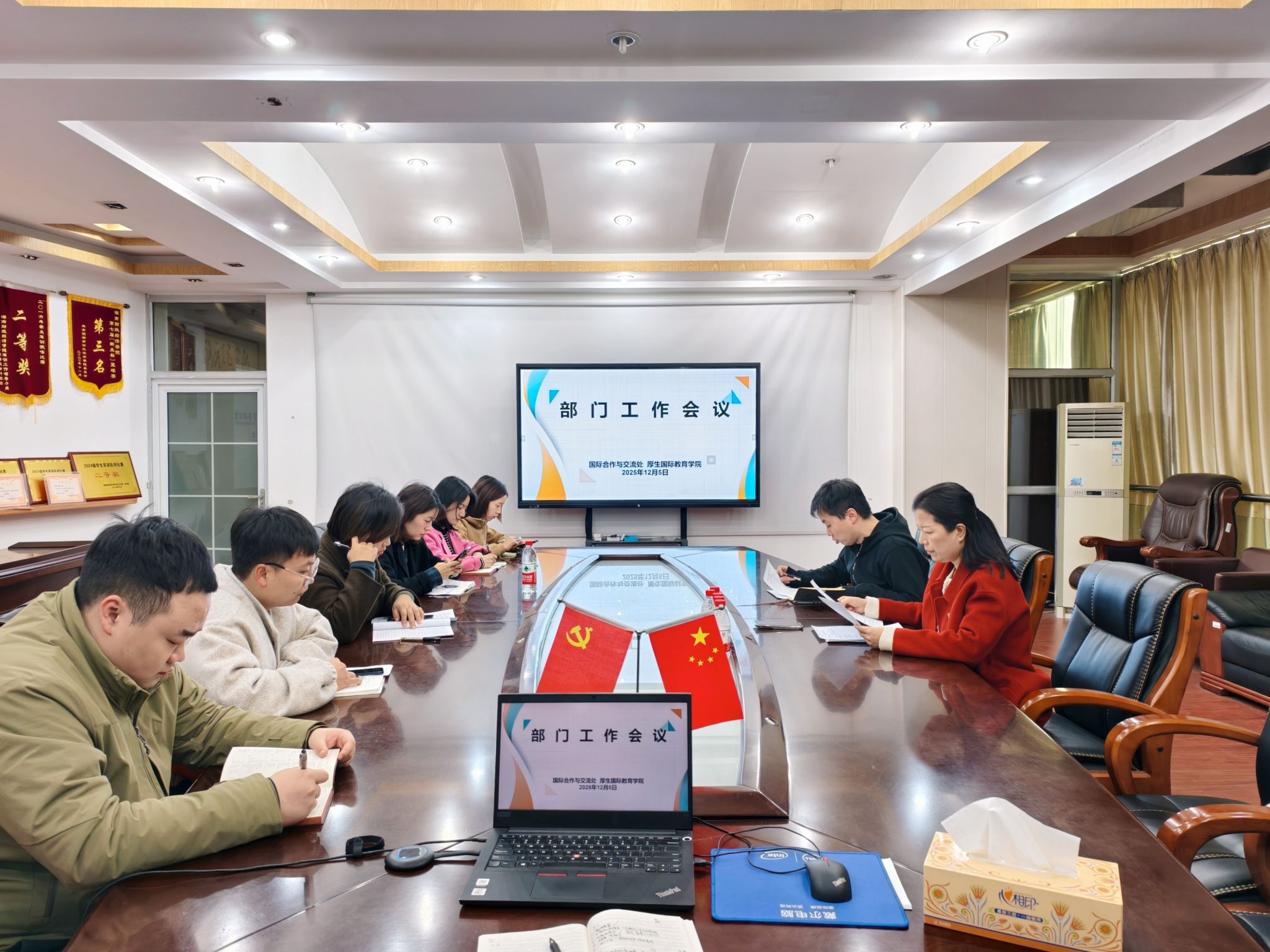 2025年12月5日,国际合作与交流处、厚生国际教育学院召开部门工作会议,围绕深入学习贯彻习近平总书记重要论述、扎实推进近期重点工作展开专题学习和工作部署。会议由直属党支部书记肖平飞主持,全体教职工参会。