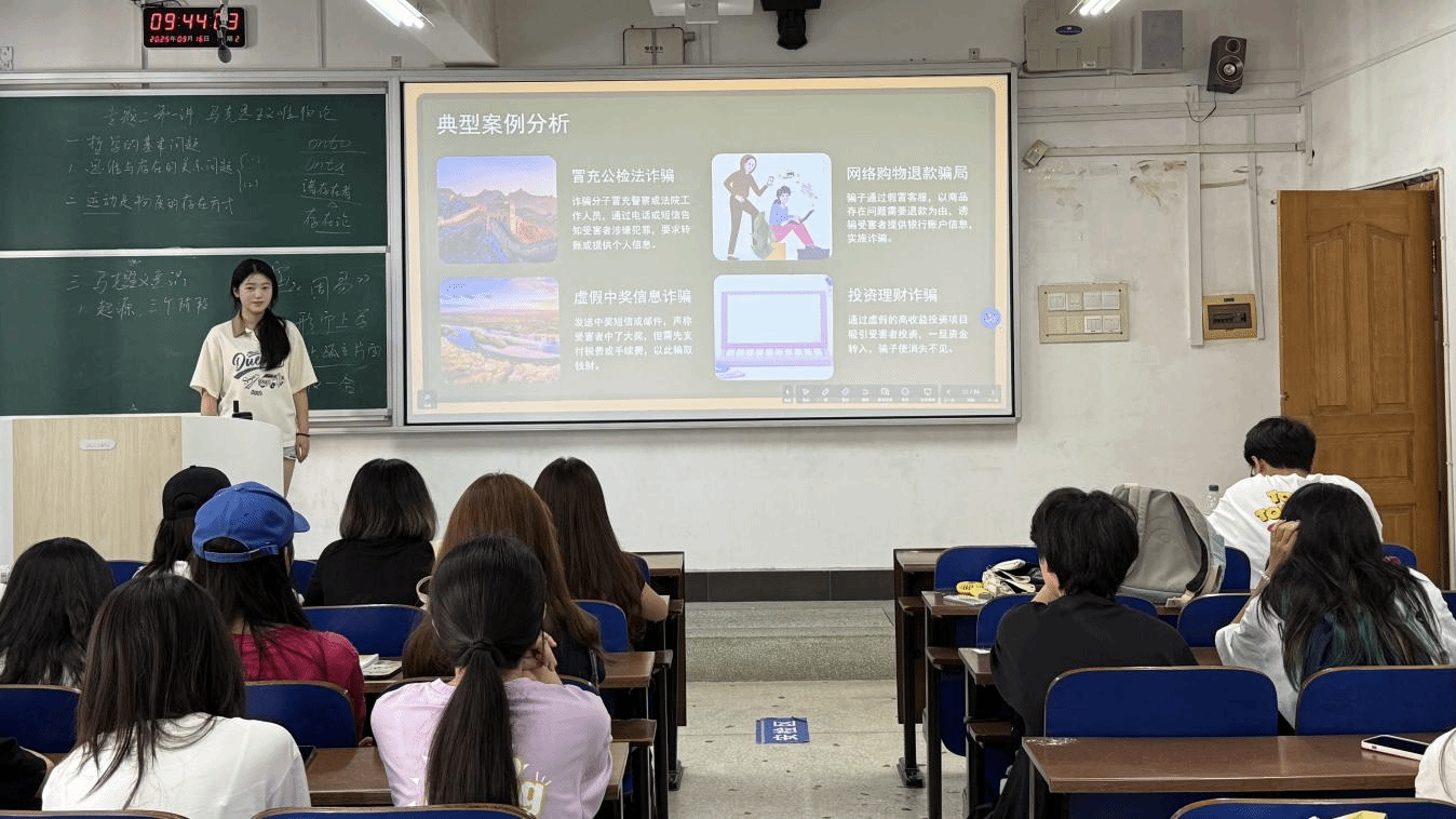 辅导员更以近期高校真实案例为切入点——详细讲述某学生因轻信“高薪代练”信息,被诱导充值数千元后失联的事件,从“骗子话术设计”“学生心理弱点”“防范关键节点”三个维度展开分析,让同学们深刻意识到“诈骗就在身边”。讲解过程中,辅导员鼓励学生分享自身遇到的“可疑经历”,现场围绕“如何识破假冒客服的退款套路”展开热烈讨论,进一步强化了学生的风险识别能力。