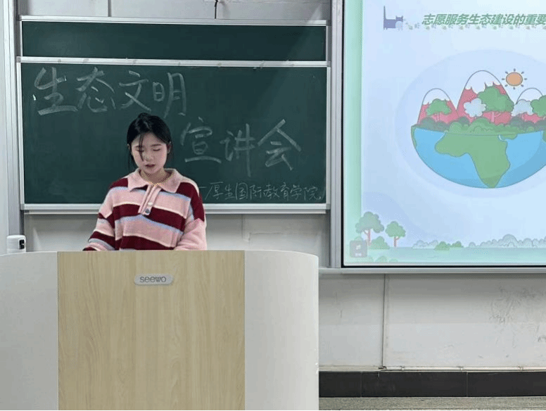 为学习贯彻习近平生态文明思想,提升青年大学生对生态文明的认识,传承和弘扬雷锋精神,厚生国际教育学院团总支社实部于2024年3月5日晚在3111教室举行了题为“弘扬雷锋精神,共筑绿色校园”的宣讲会,本次宣讲会由曾荟萍同学主讲,王筱烨同学主持。