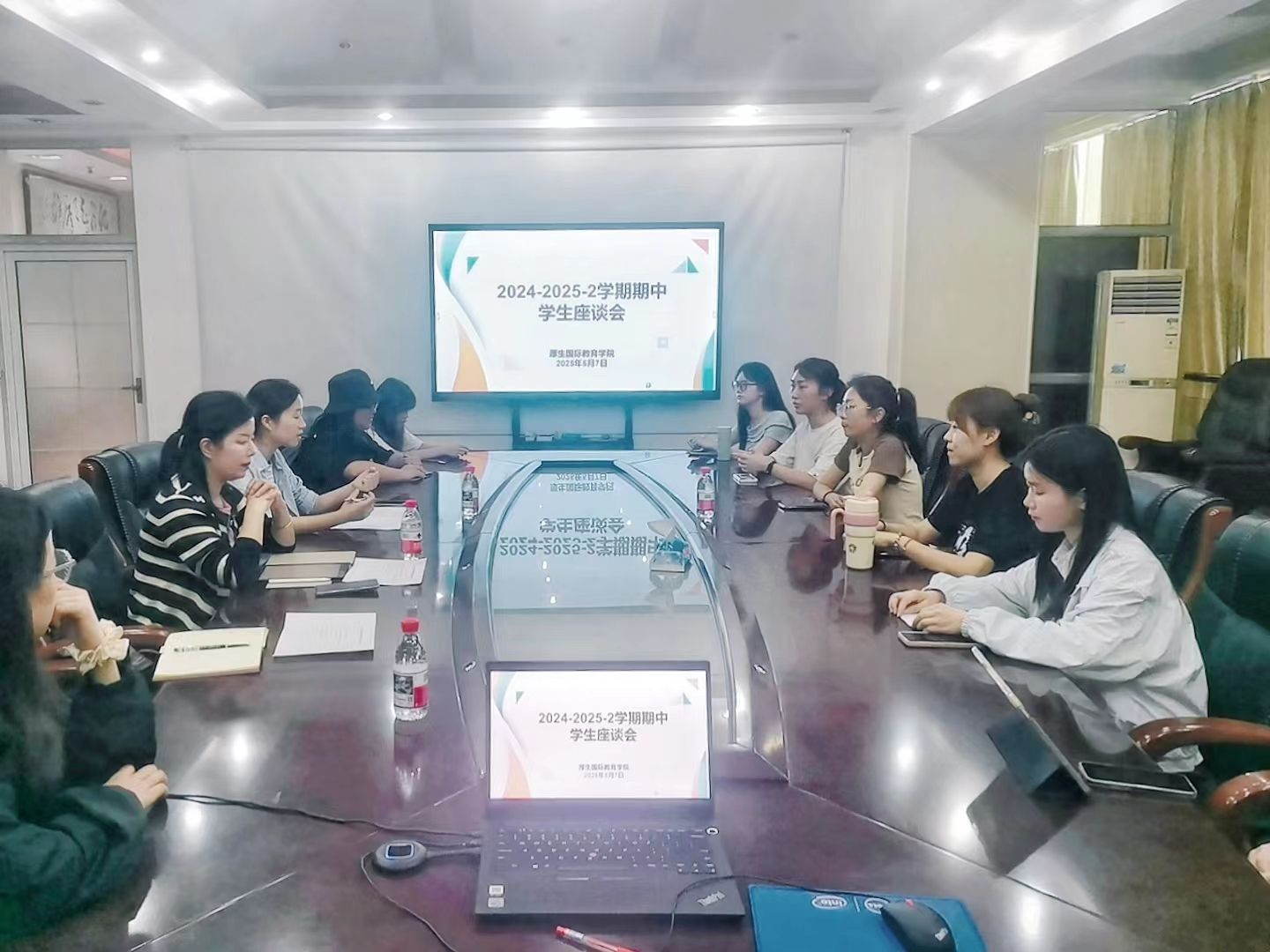 为了进一步强化教学质量监控,广泛收集师生对教学工作的意见与建议,5月7日,厚生国际教育学院在830会议室召开期中教师、学生座谈会。学院直属党支部书记肖平飞以及全体教师、学生代表参加了座谈,围绕教学管理、课堂质量、实践环节等内容展开深入交流。