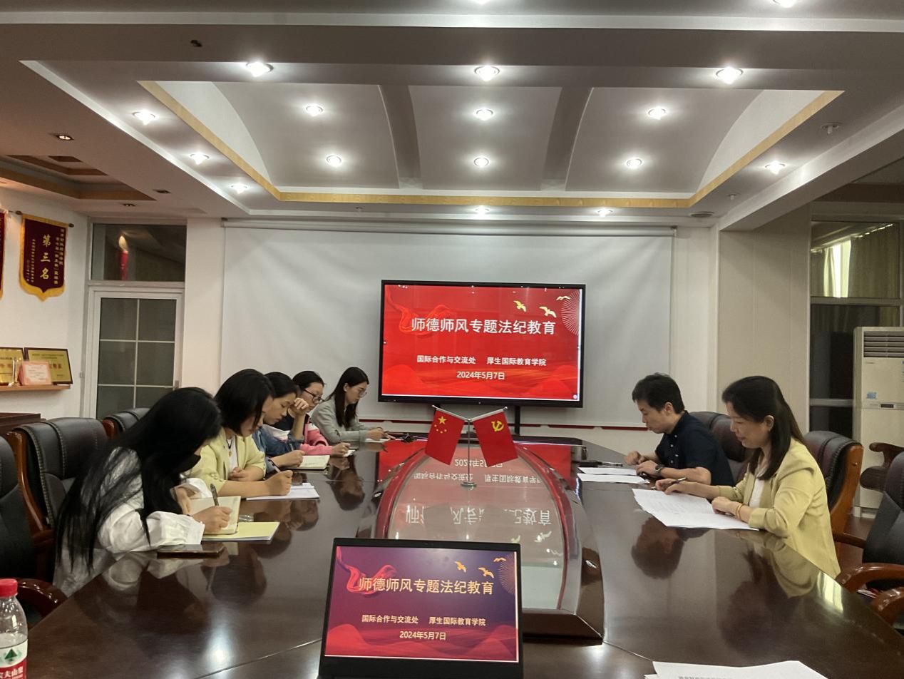 为深入贯彻落实习近平新时代中国特色社会主义思想和党的二十大精神,大力弘扬高尚师德,引导教师加强师德修养,践行师德规范,5月7日下午,国际合作与交流处、厚生国际教育学院召开师德师风法纪教育专题学习会,部门全体人员参加,会议由直属支部书记肖平飞主持。