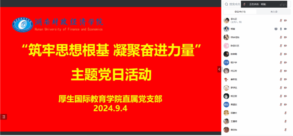 2024年9月4日下午,厚生国际教育学院直属党支部开展“筑牢思想根基 凝聚奋进力量”主题党日活动,本次主题党日由直属支部书记肖平飞主持,全体党员参加,活动采取线上、线下相结合的形式进行。