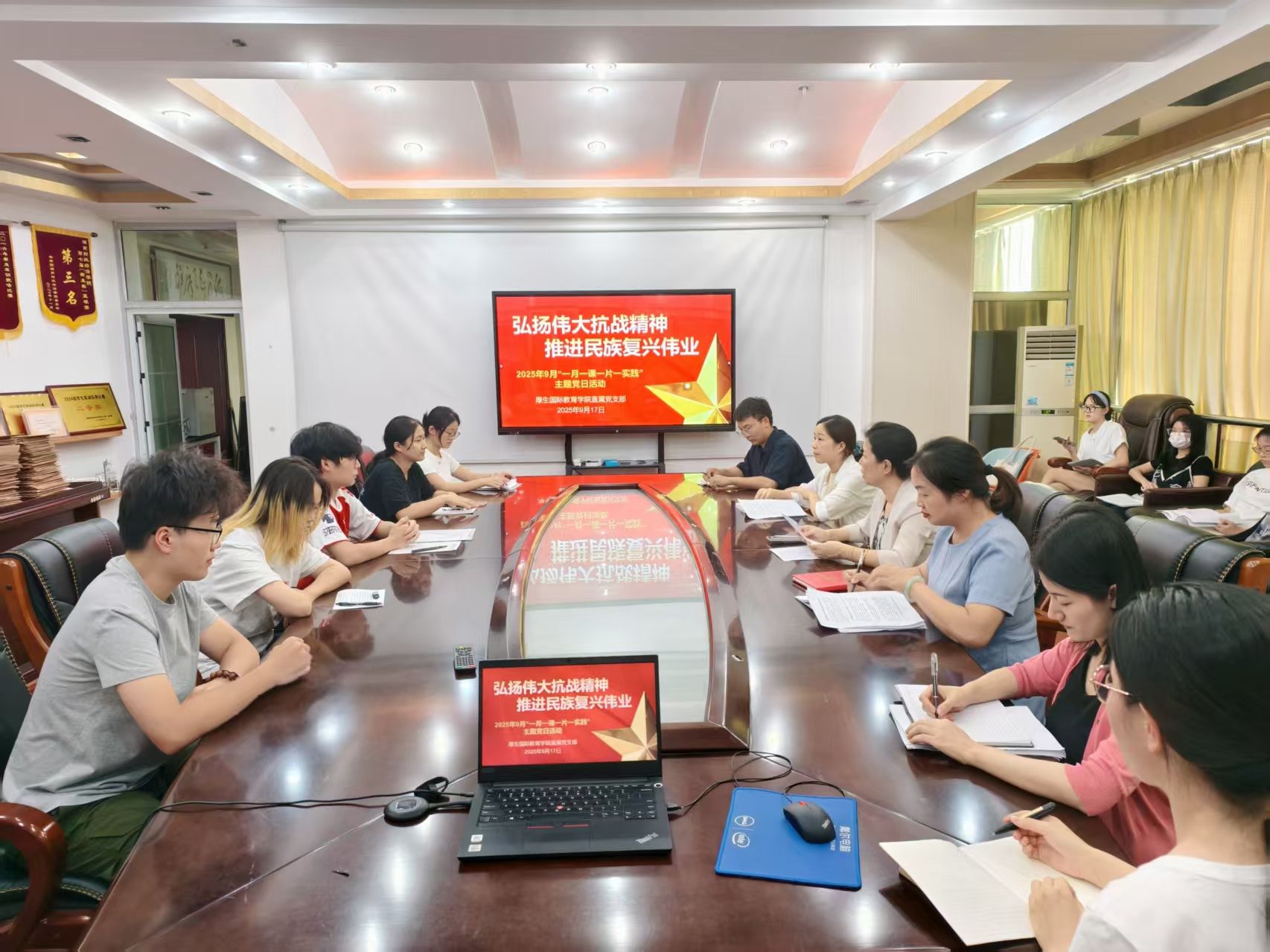 2025年9月17日,厚生国际教育学院直属党支部在办公楼830会议室组织开展了9月份主题党日活动,本次活动以“弘扬伟大抗战精神,推进民族复兴伟业”为主题,通过理论学习、微党课宣讲、观看专题片等多种形式,引导全体党员深刻感悟伟大抗战精神,强化使命担当。