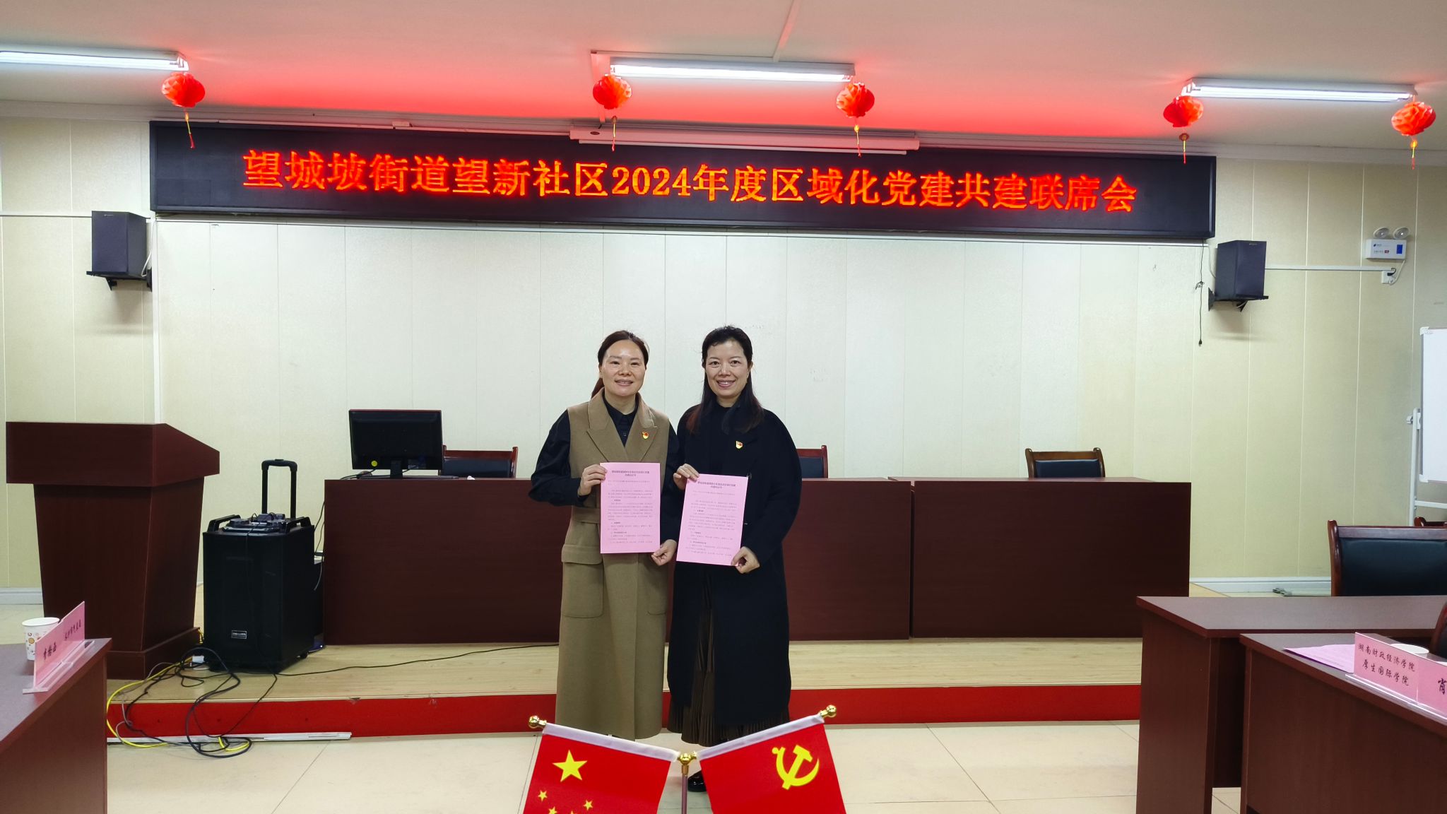 (本网讯)为深入学习贯彻习近平新时代中国特色社会主义思想,贯彻落实党的二十大精神,以党建共建为引领,不断提高党支部创造力、凝聚力、战斗力,3月18日,厚生国际教育学院直属党支部与岳麓区望城坡街道望新社区在社区会议室举行了党建共建签约仪式,厚生国际教育学院直属支部书记肖平飞、支部组织委员马艳参加会议。