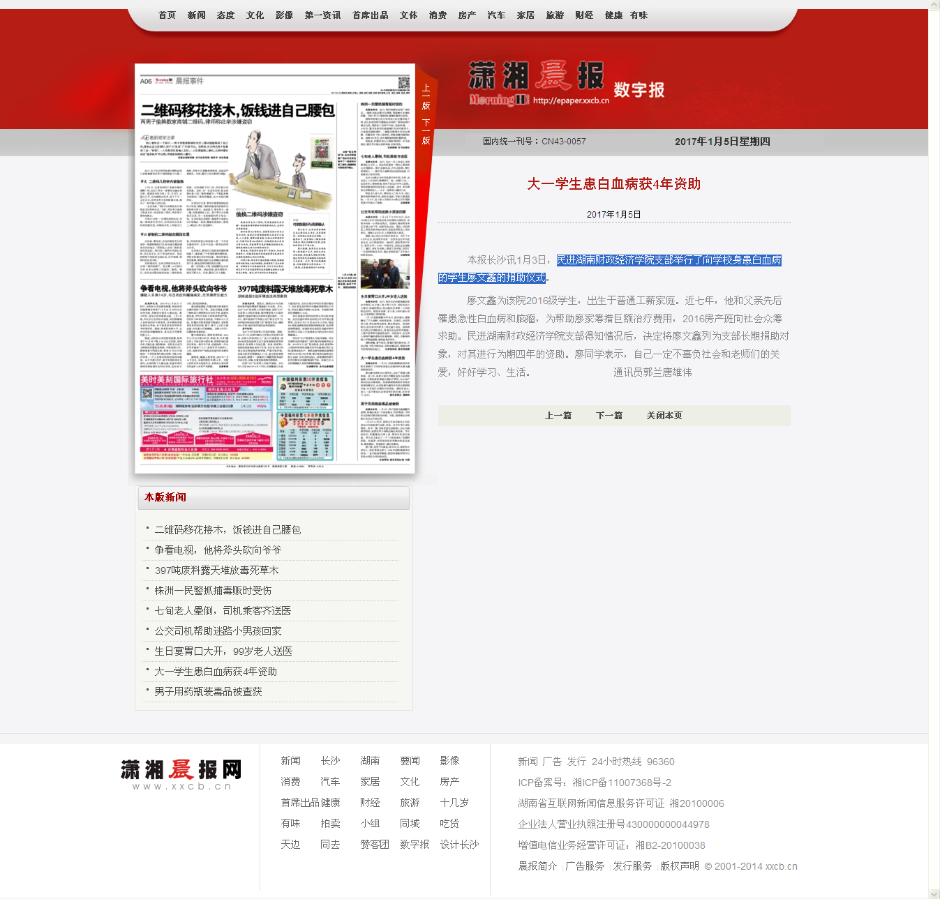 1月5日,潇湘晨报以《大一学生患白血病获4年资助》报道了Beat365民进Beat365唯一官方网站支部将学校身患白血病的学生廖文鑫进行为期四年的资助。 报道链接:http://epaper.xxcb.cn/xxcba/html/2017-01/05/con...