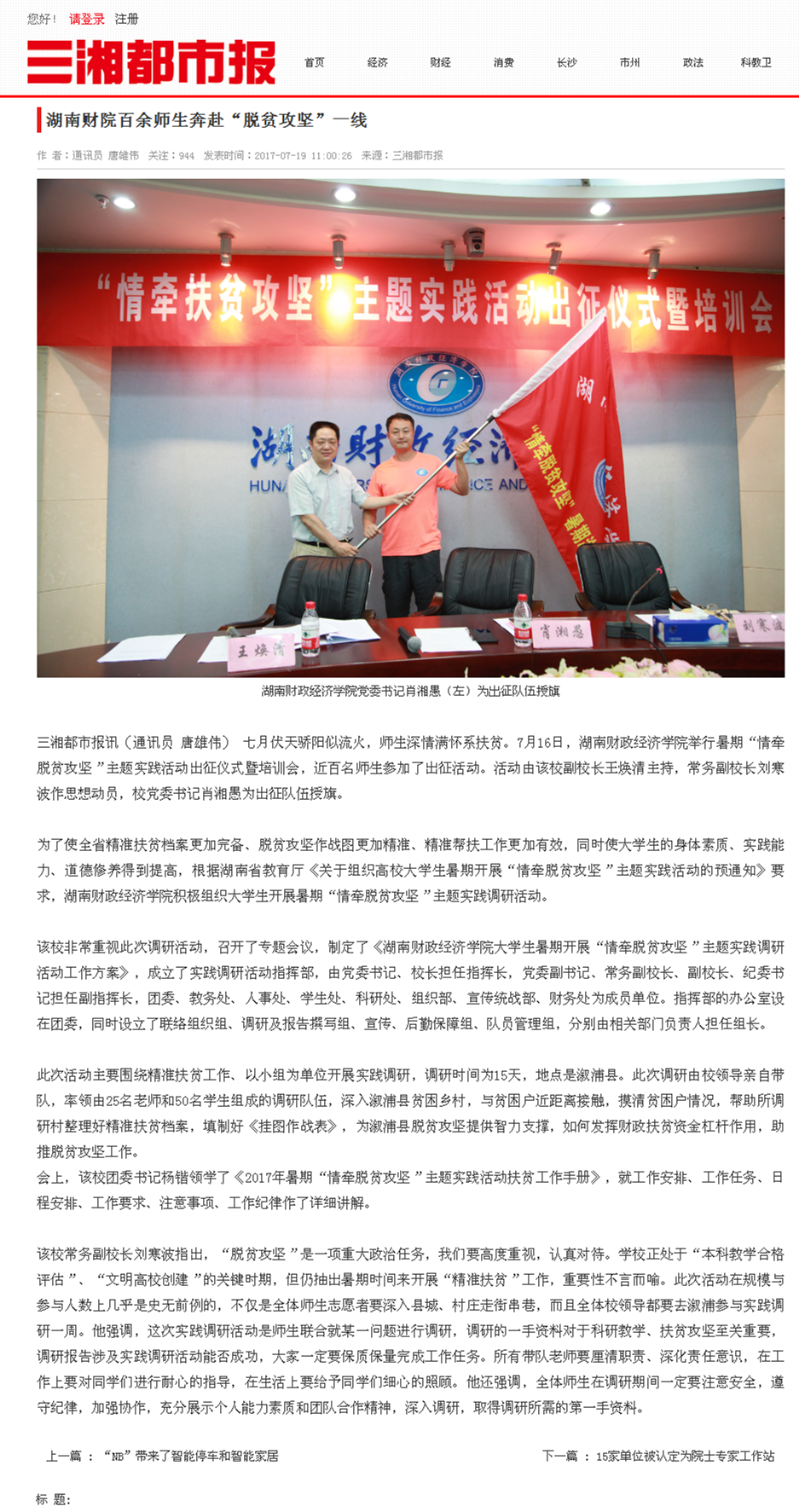 7月16日,Beat365举行暑期“情牵脱贫攻坚”主题实践活动出征仪式暨培训会,近百名师生参加了出征活动。中国新闻网、红网、新湖南、星辰在线、三湘都市报、湖南教育网相继对相关情况进行了报道。湖南教育网:http://www....