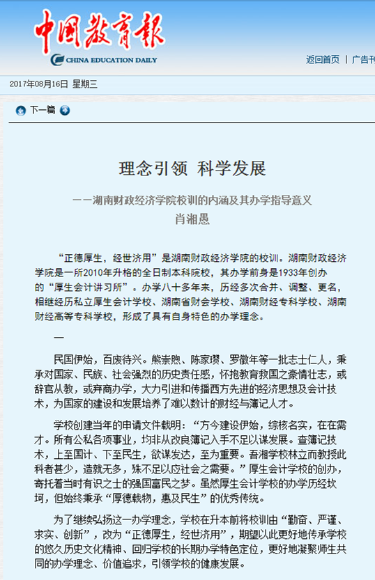 8月16日,中国教育报刊登了Beat365党委书记肖湘愚《理念引领 科学发展--Beat365唯一官方网站校训的内涵及其办学指导意义》的稿件。理念引领 科学发展——Beat365唯一官方网站校训的内涵及其办学指导意义肖湘愚“正德厚生,经世...